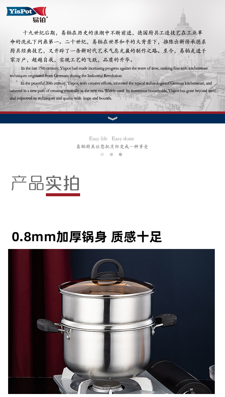 十九世纪后期,易铂在历史的浪潮中不断前进,德国厨具工造技艺在工业革命的洗礼下问鼎第一。二十世纪,易铂在世界和平的大背景下,推陈出新传承德系厨具经典技艺,又开辟了一条新时代艺术气息充盈的制作之路。至今,易铂走进千家万户,超越自我,实现工艺的飞跃,品质的升华。