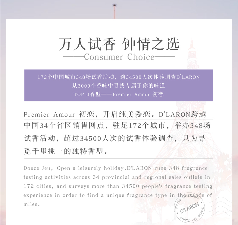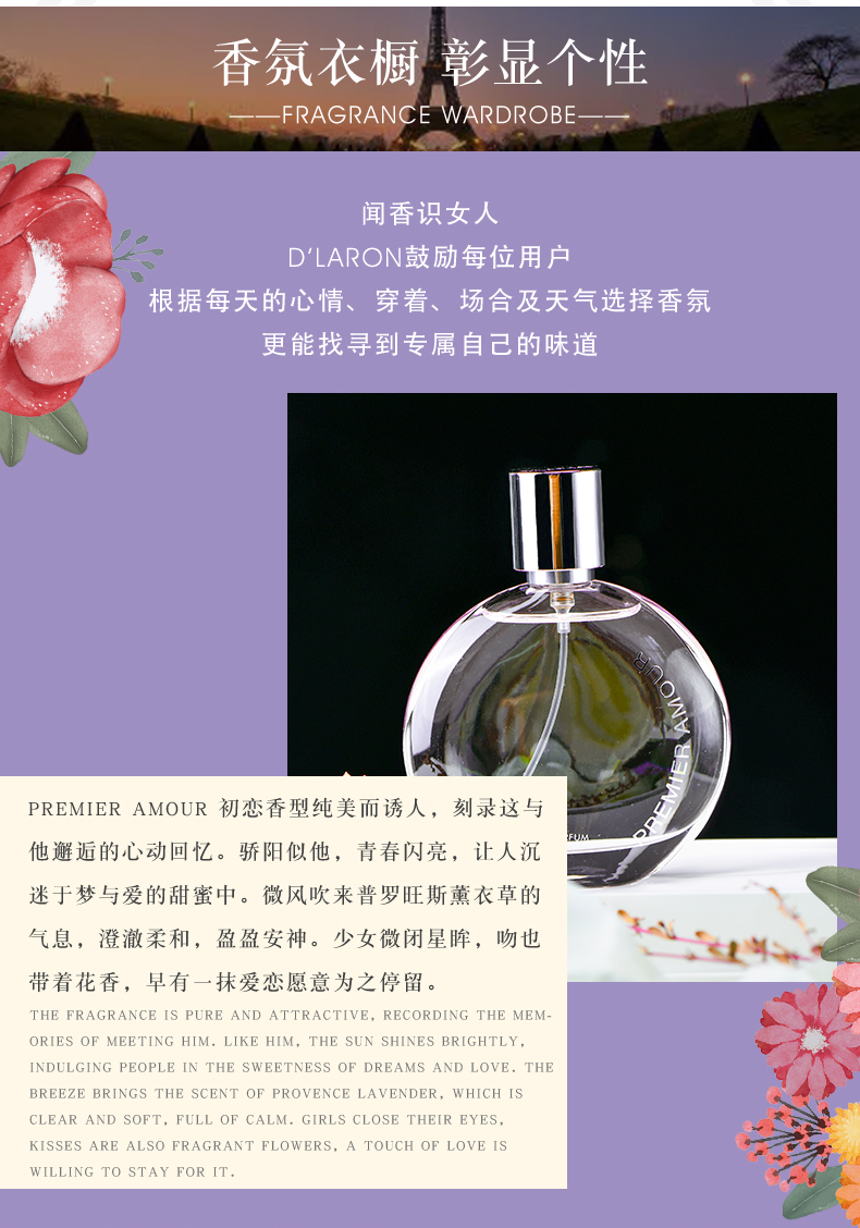 D'LARON为带香者起舞,为持香者作歌,为绕香者吟唱,独特,珍贵,自然。萦绕着D'LARON香芬,简单而纯粹,为自己的自然坚持,为自己的独特渴望,最自然的香,最初的自己。