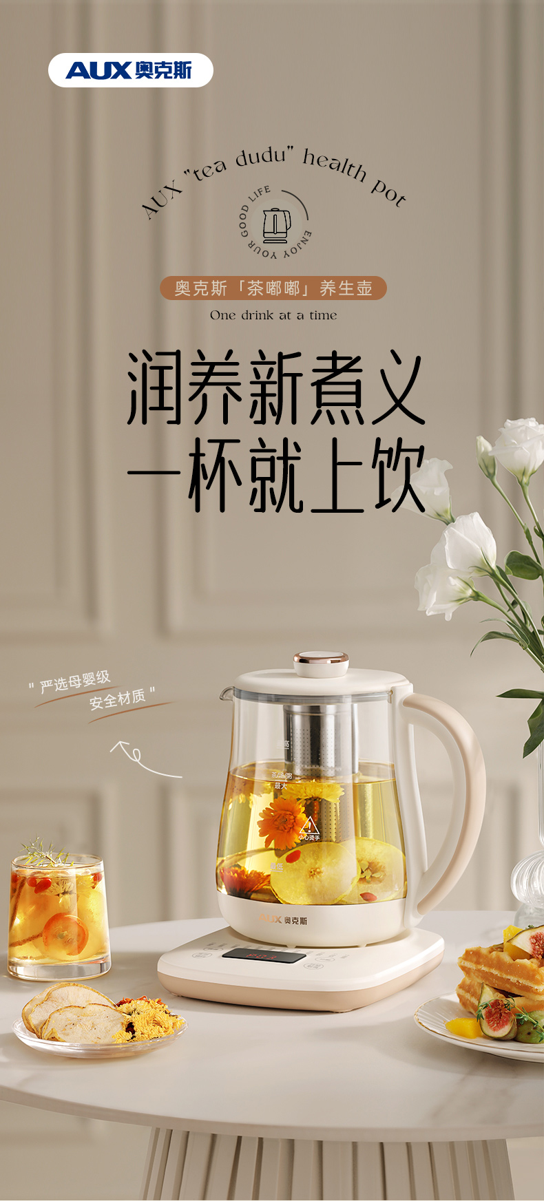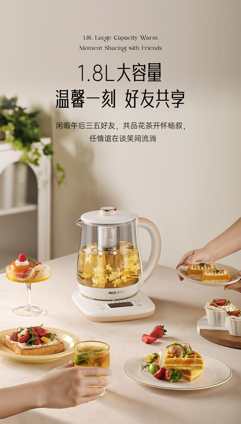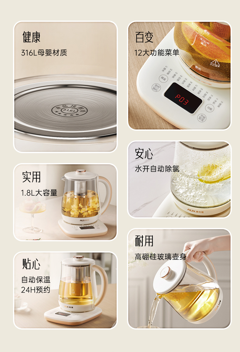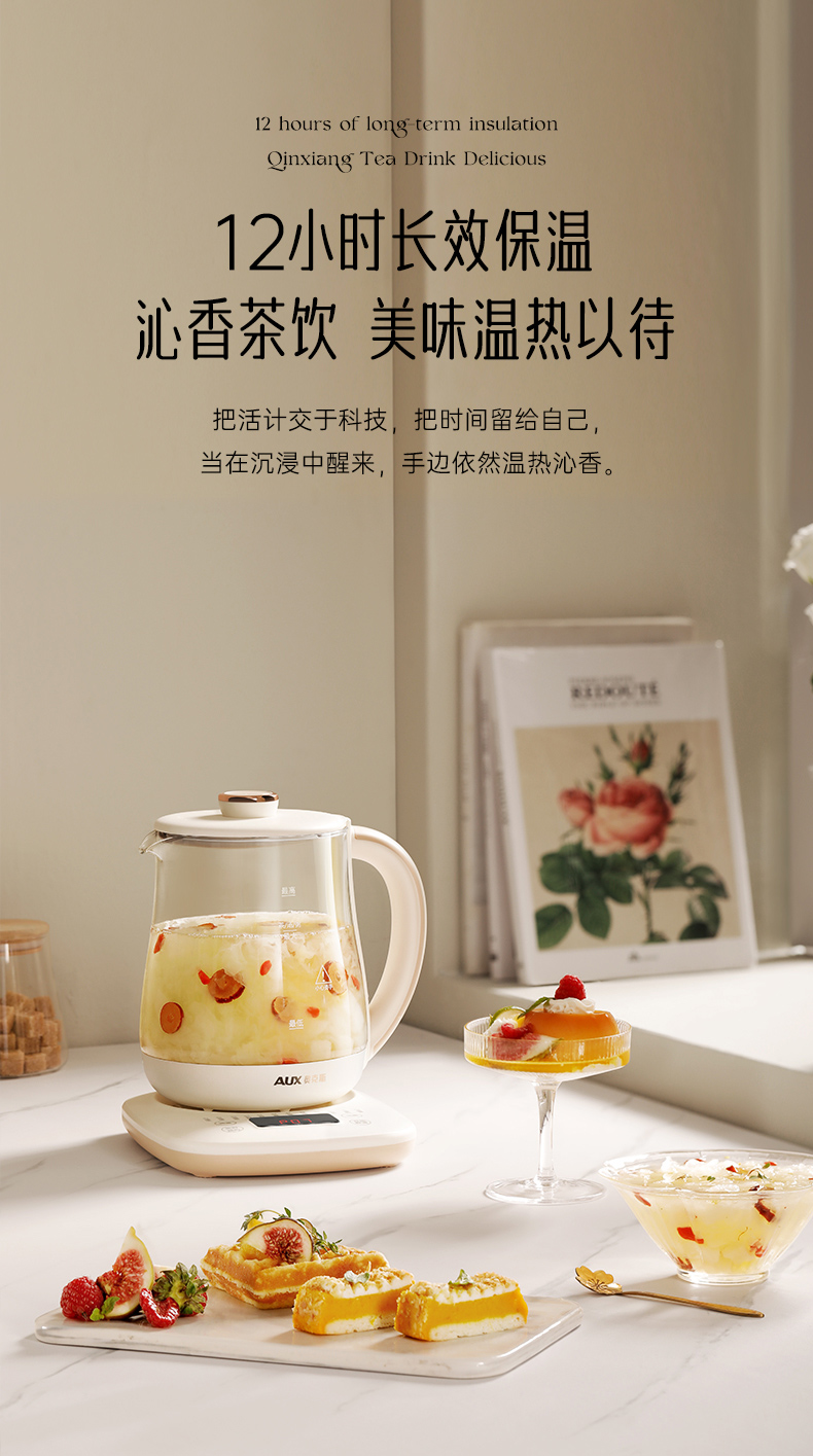 1.1.8L大容量 2.24小时智能预约功能 3.12大养生功能,满足多种烹煮需求 4.多段段调温,智能自动保温