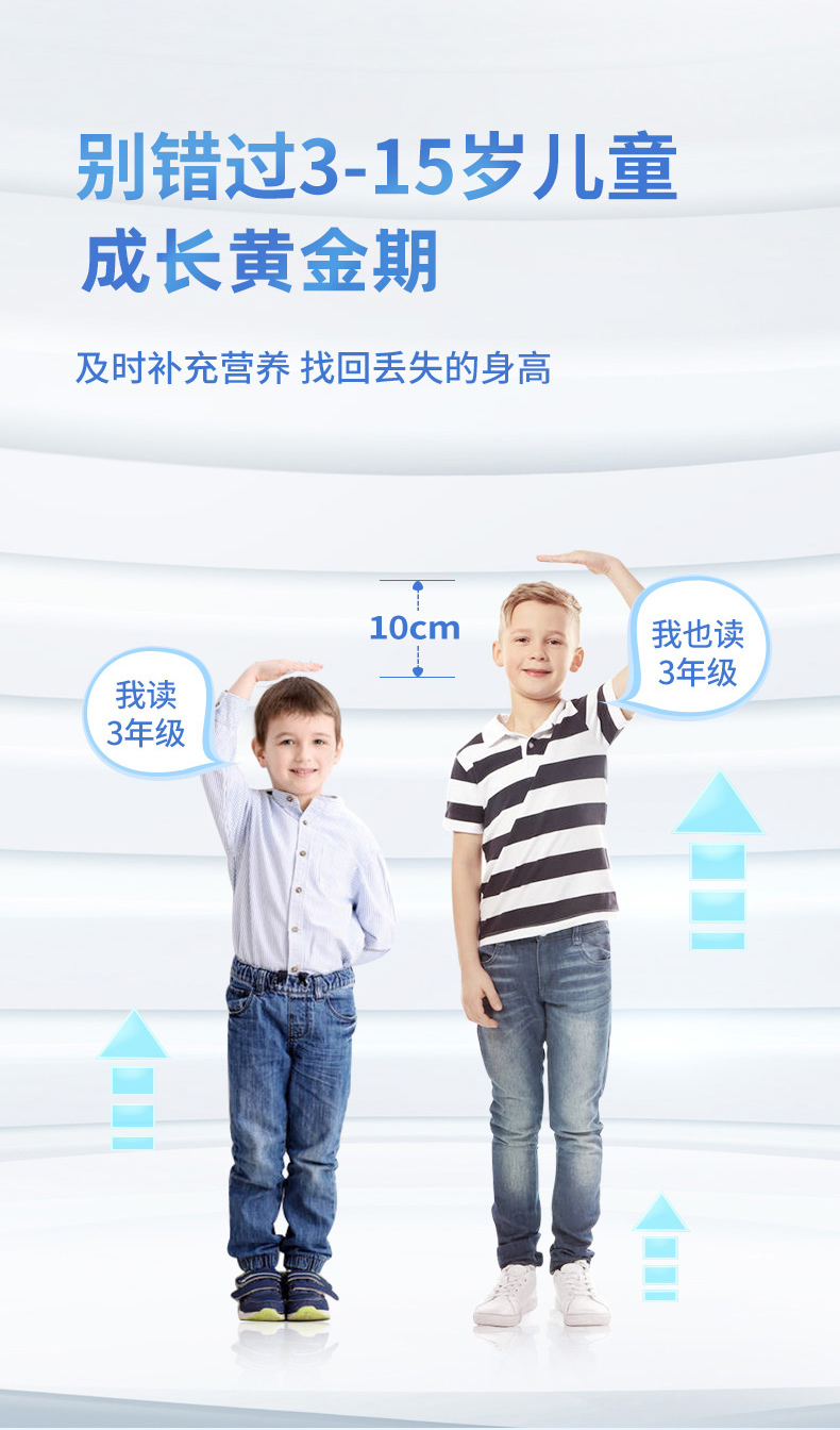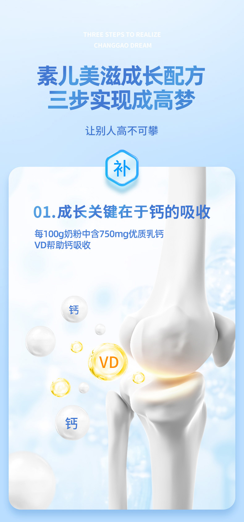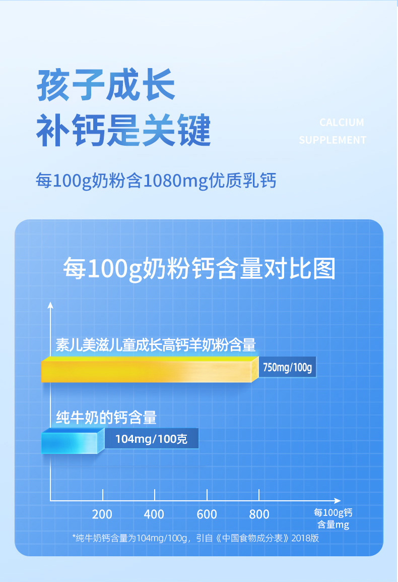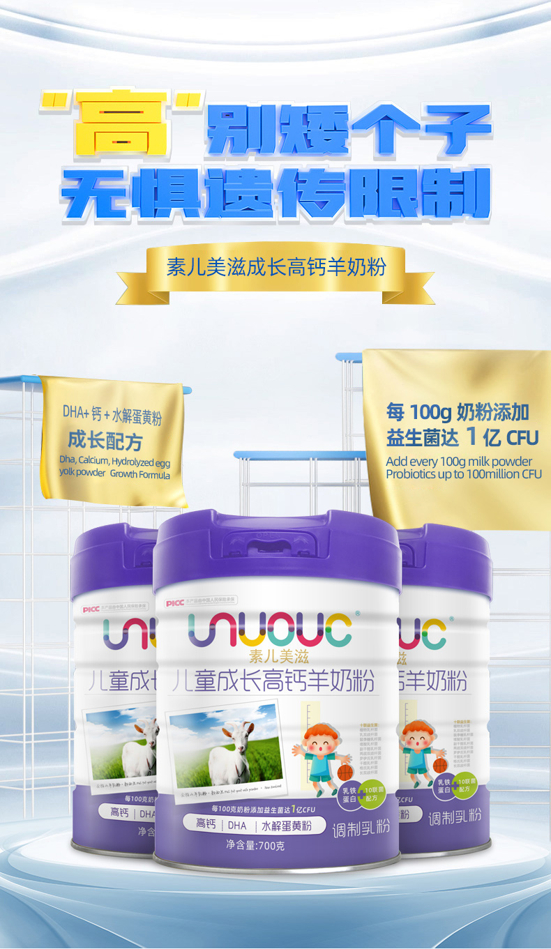 素儿美滋提醒您:别错过3-15岁儿童成长黄金期! 素儿美滋儿童成长高钙羊奶粉-奶源源自有天然牧场之称的新西兰,添加钙、水解蛋黄粉、乳铁蛋白、DHA及十种益生菌;“高”别矮个子,无惧遗传限制;圆您身高梦!