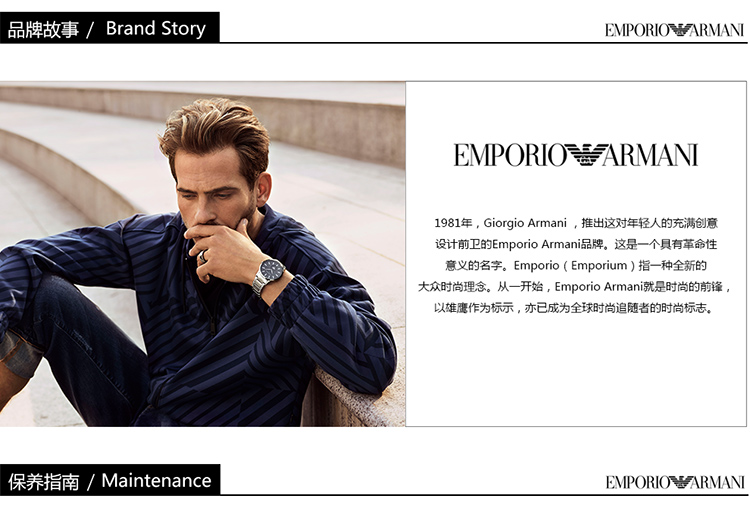 1975年由时尚设计大师乔治·阿玛尼(Giorgio Armani)创立于意大利米兰,他以使用新型面料及优良制作而闻名。阿玛尼品牌标志是由一只在往右看的雄鹰变形而成。2014年5月15日,乔治·阿玛尼完成了对A|X Armani Exchange剩余50%股份的收购,实现对该品牌100%控股。该品牌目标群体是年轻人。