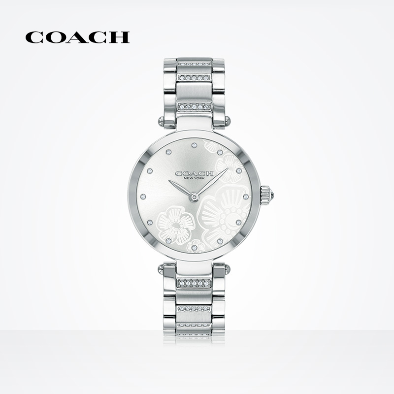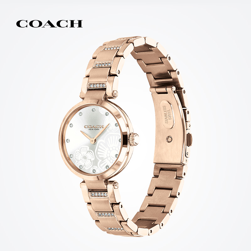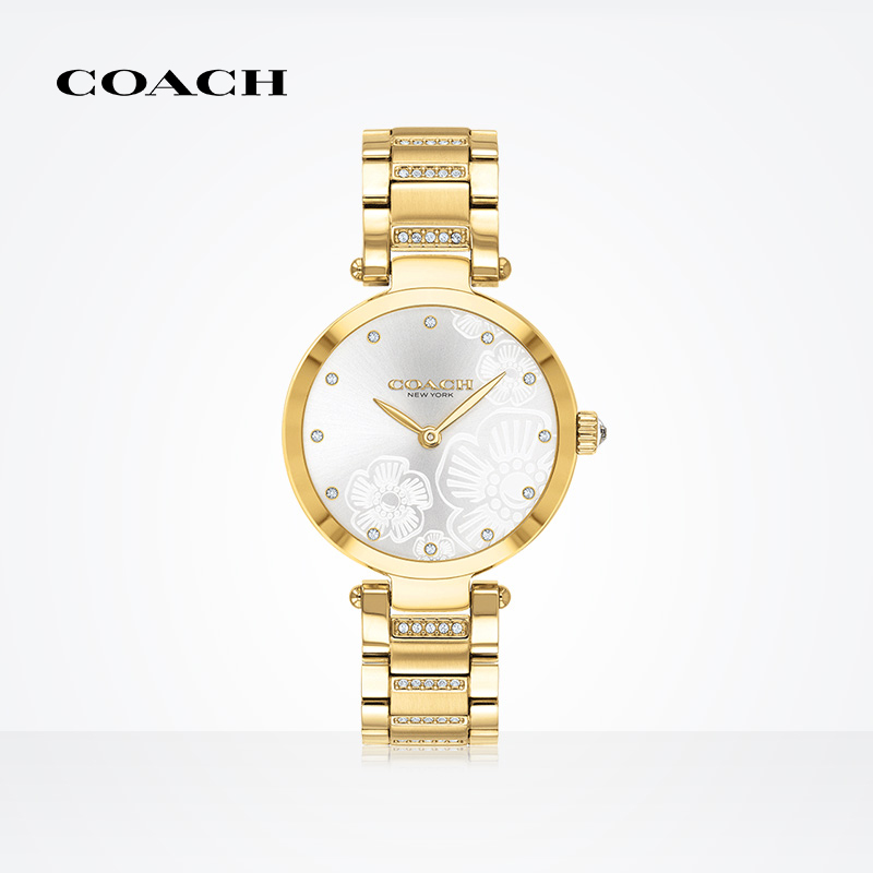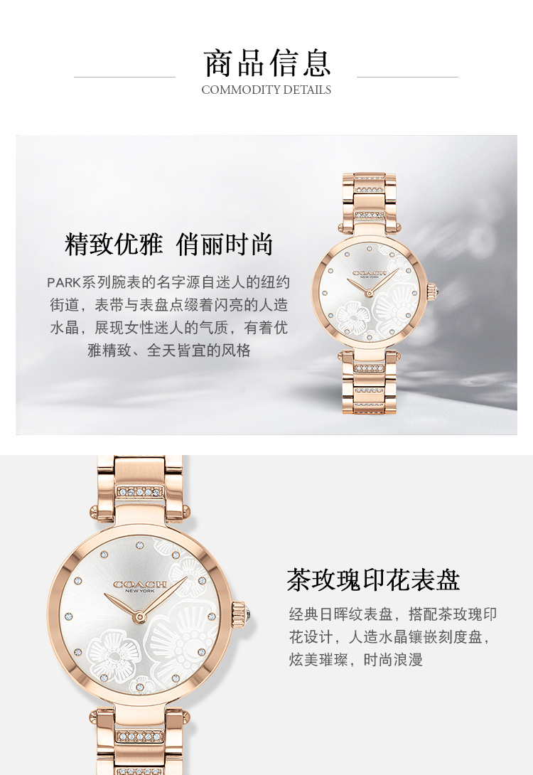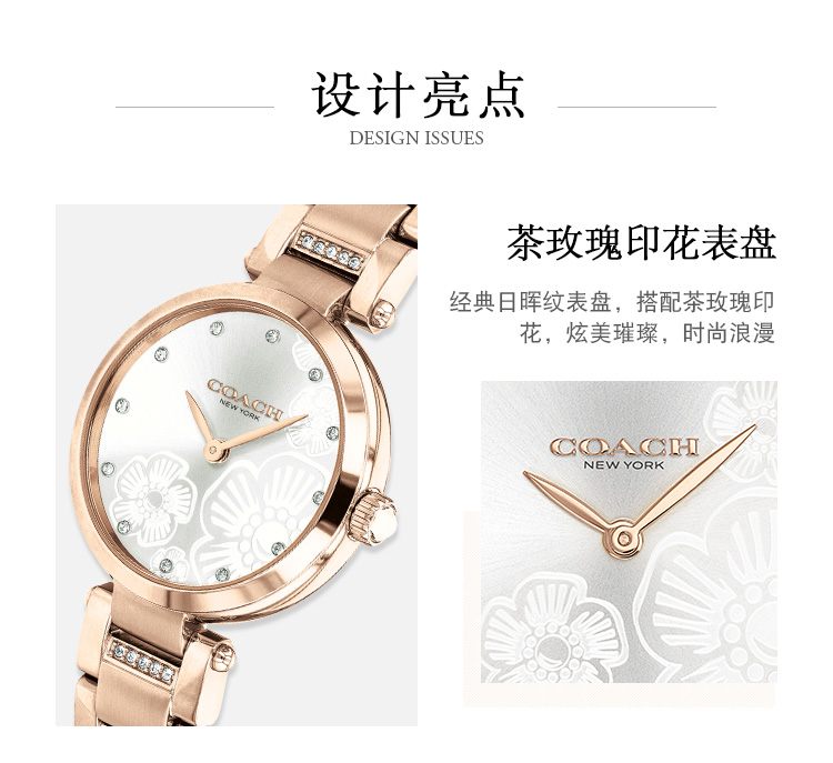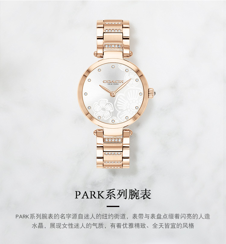 COACH/蔻驰PARK系列 茶玫瑰印花表盘女士腕表 优雅质感日晖纹表盘钢带女石英手表