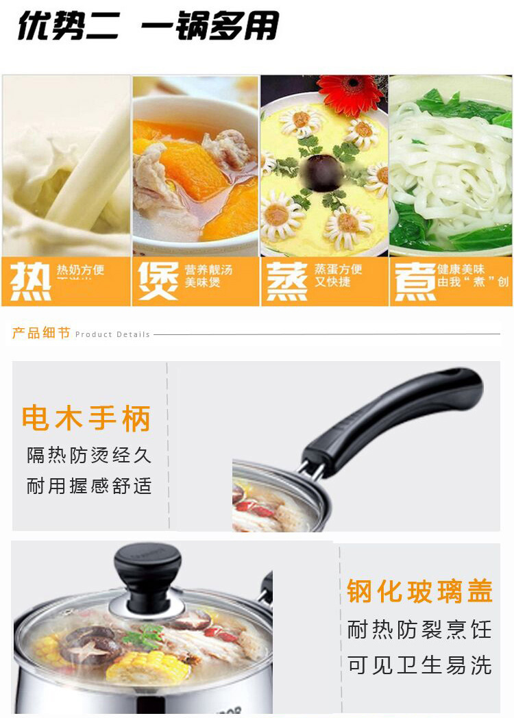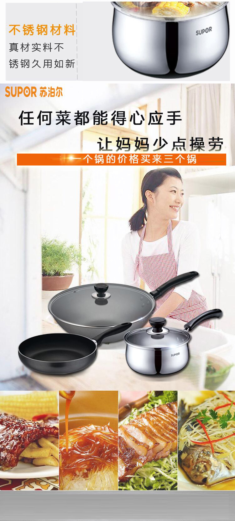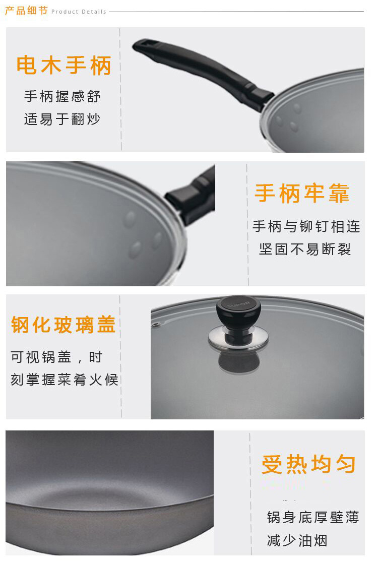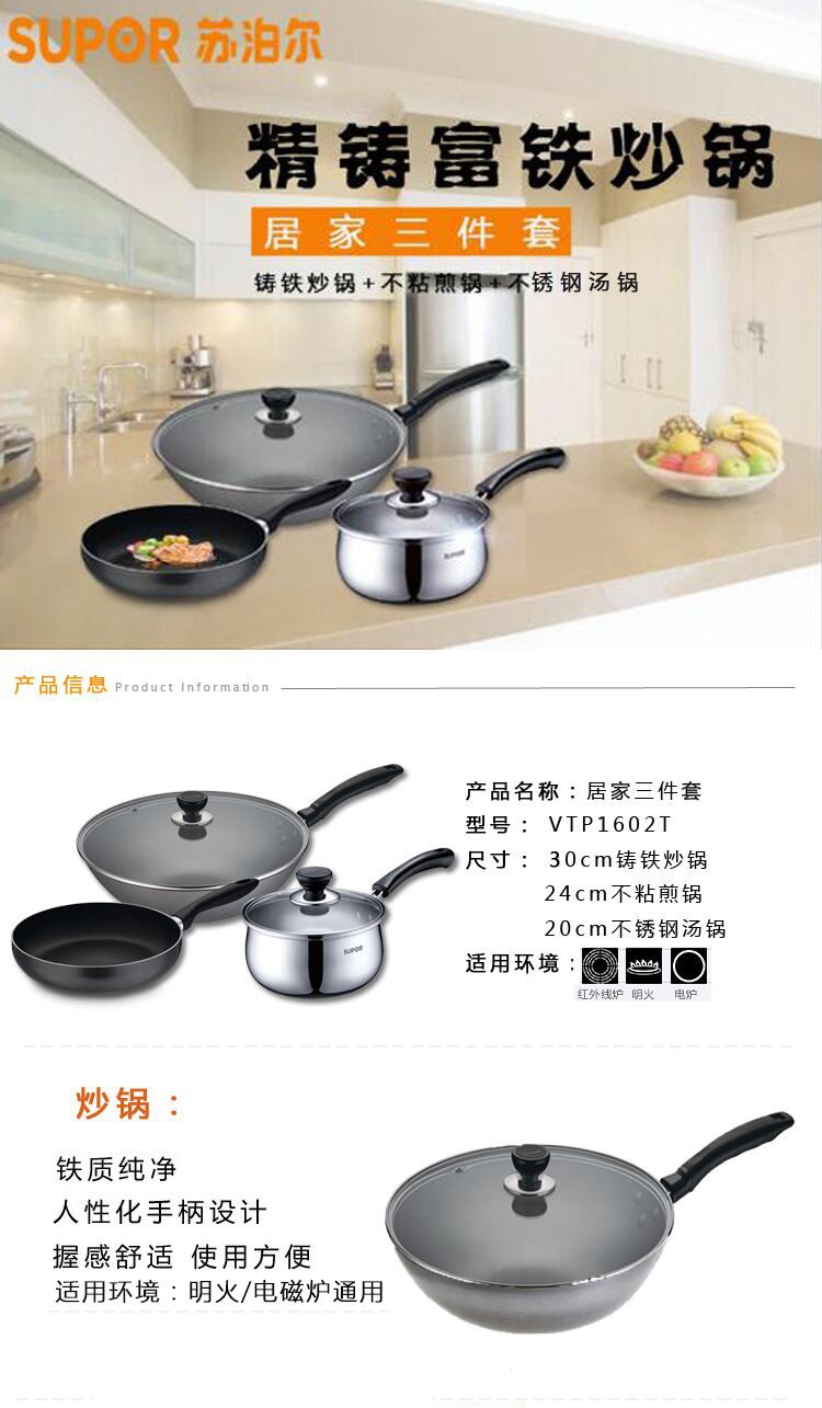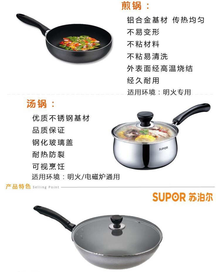 1、优质精铁,铁质纯净,补铁健康 2、人性化手柄设计,握感舒适,使用方便 汤锅: 1、优质不锈钢基材,品质保证 2、钢化玻璃盖,耐热防裂,可视烹饪 煎锅: 1、铝合金基材,传热均匀,不易变形 2、高级不粘材料,不粘易清洗 3、外表面经高温烧结,经久耐用