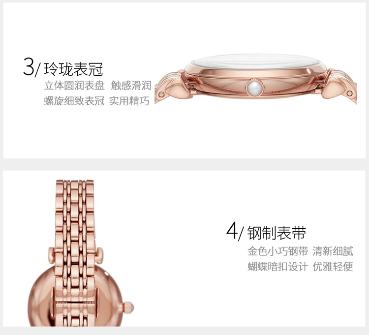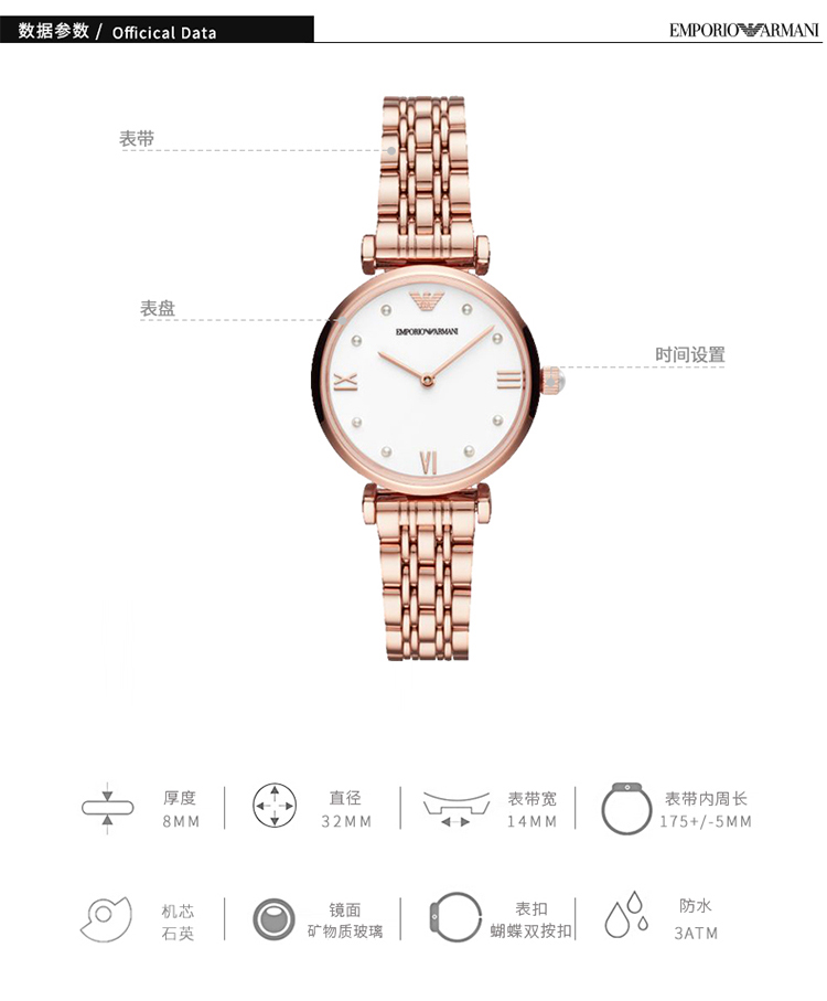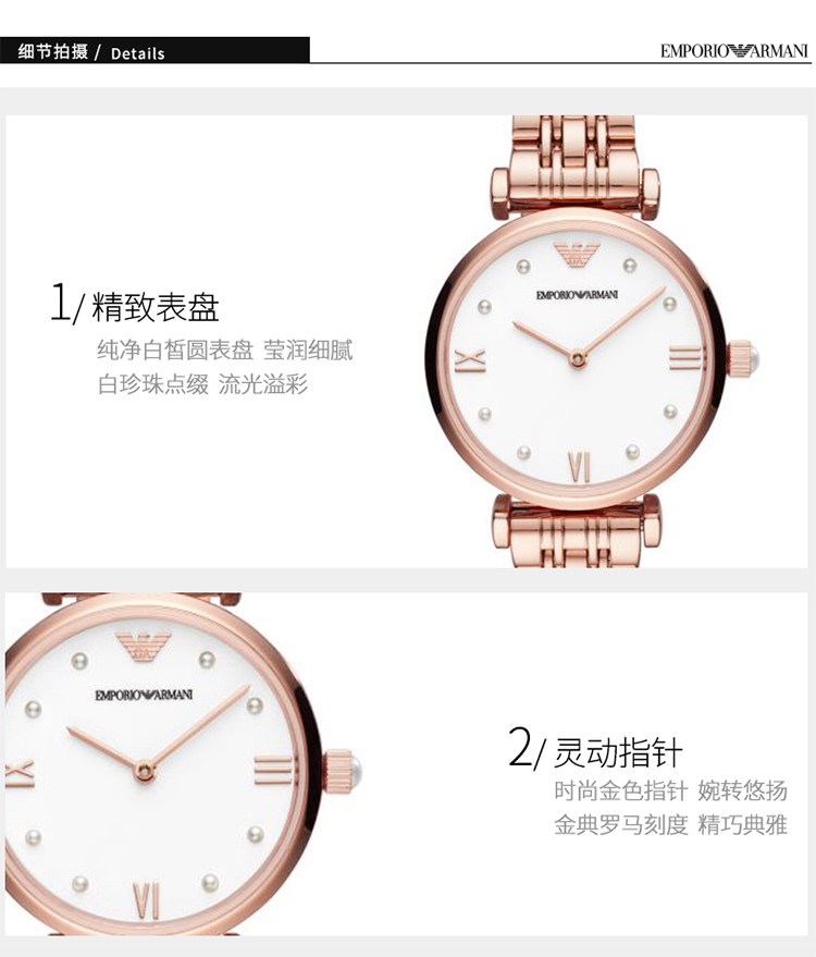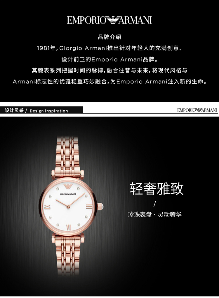 EmporioArmani/阿玛尼是1981年,GiorgioArmani推出针对年轻人的充满创意、设计前卫的Emporio Armani品牌。其腕表系列把握时间的脉搏,融合往昔与未来, 将现代风格与Armani标志性的优雅稳重巧妙融合,为EmporioArmani注入新的生命。