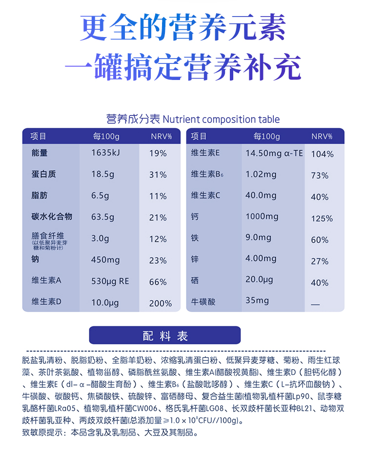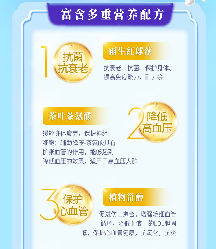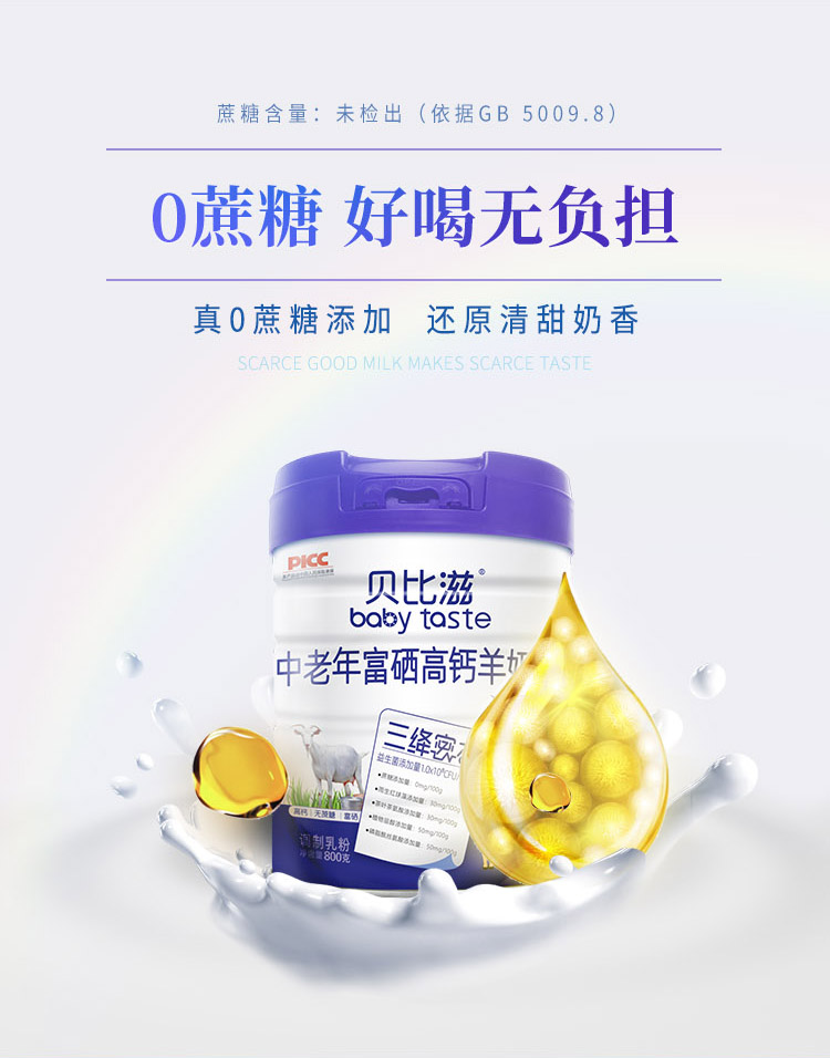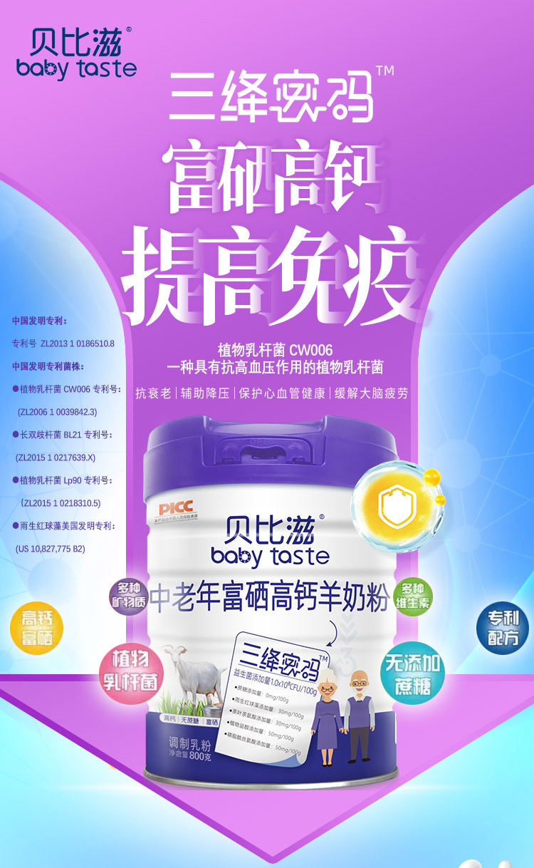 贝比滋中老年奶粉添加降三高专利益生菌、雨生红球藻、茶叶茶氨酸、植物甾醇、磷脂酰丝氨酸;三高糖友都能喝!