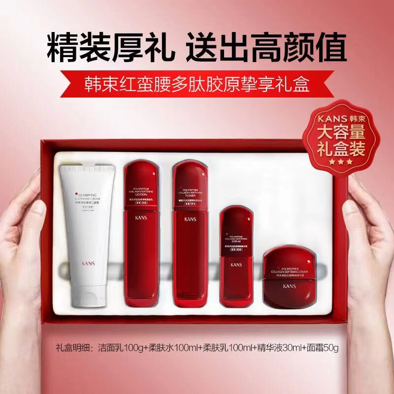 韩束红蛮腰套盒洁面、水、乳、精华、面霜五件套。 不仅可以抗氧、补水保湿,还能提亮肤色、紧致肌肤,还能抗皱抗初老哦!简直是完美的护肤礼盒啊❗️