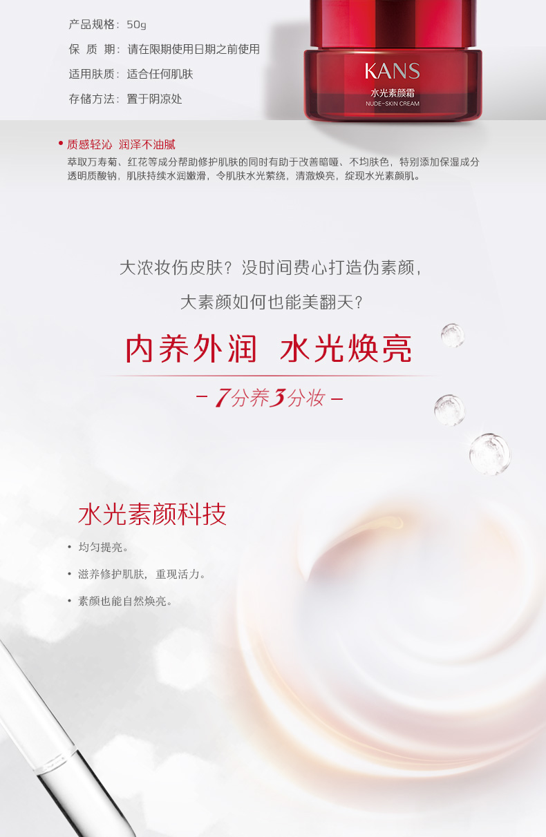 产品换新啦,克数与老款相同,放心购买 水光素颜霜 特点:匀亮肤色 改善暗沉