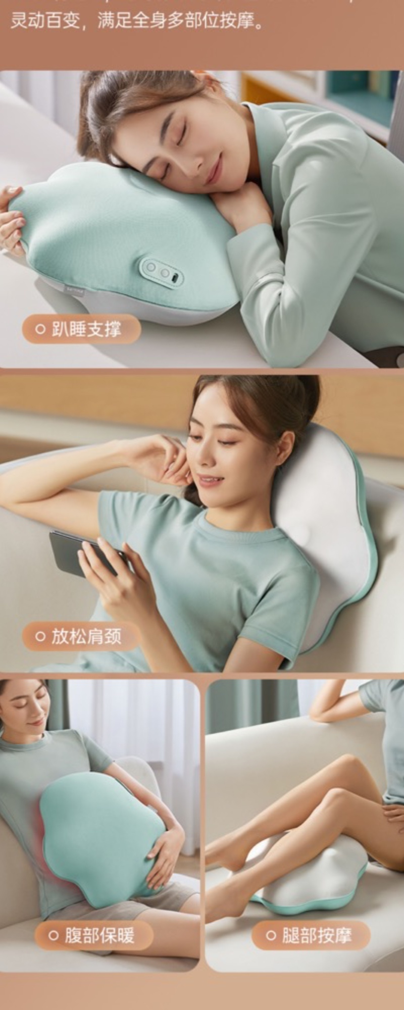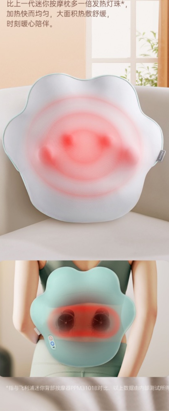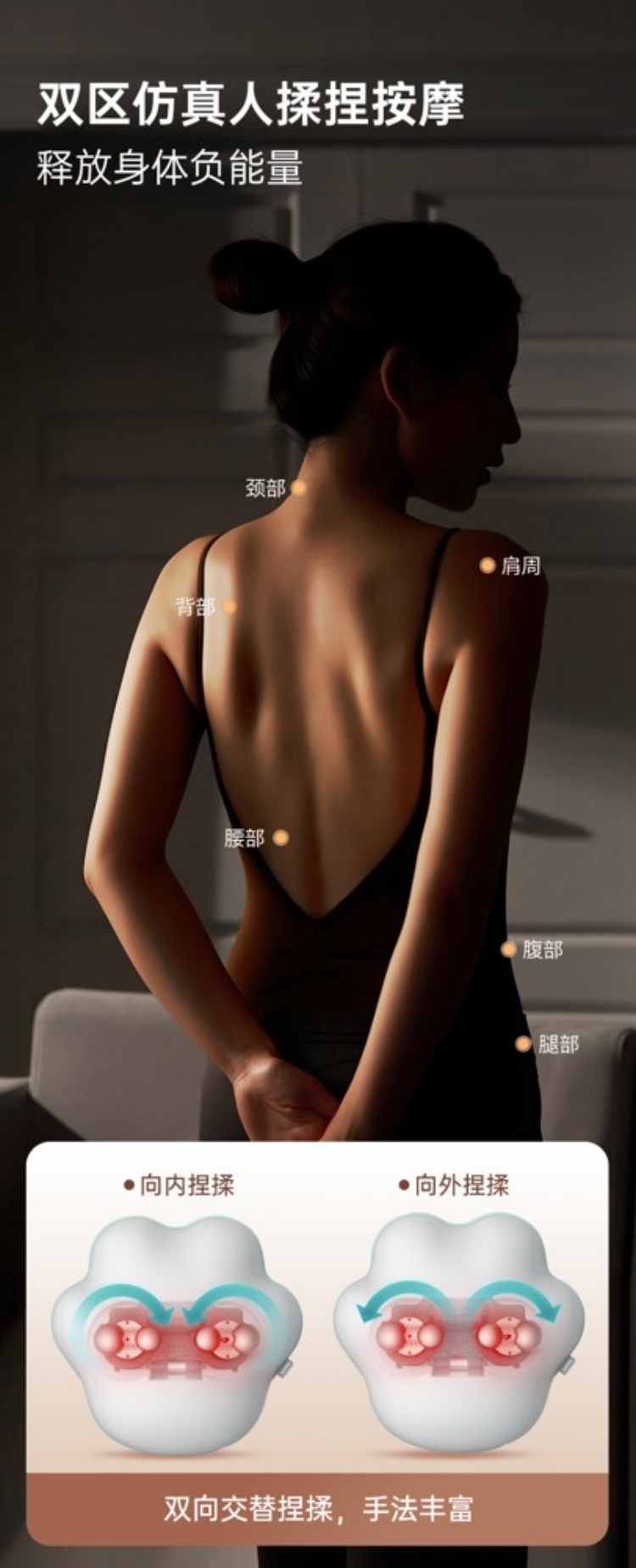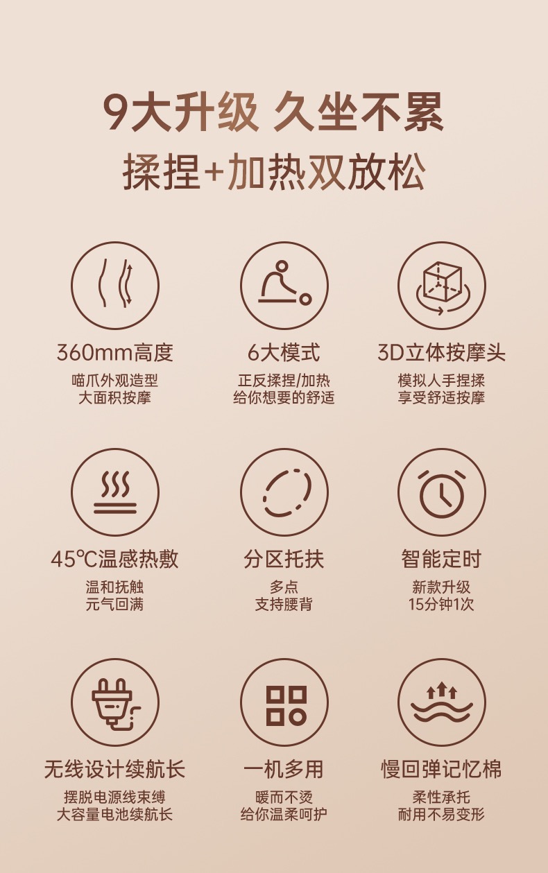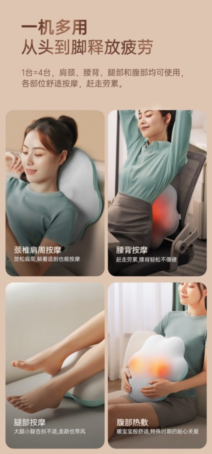 仿真双向揉捏升级变速体验 •45℃温感热敷边按边敷才过瘾 •甄选内外材质透气面料x柔软内胆 •预设3大模式转速/转向多组合 •105min长续航一周一充倍省心