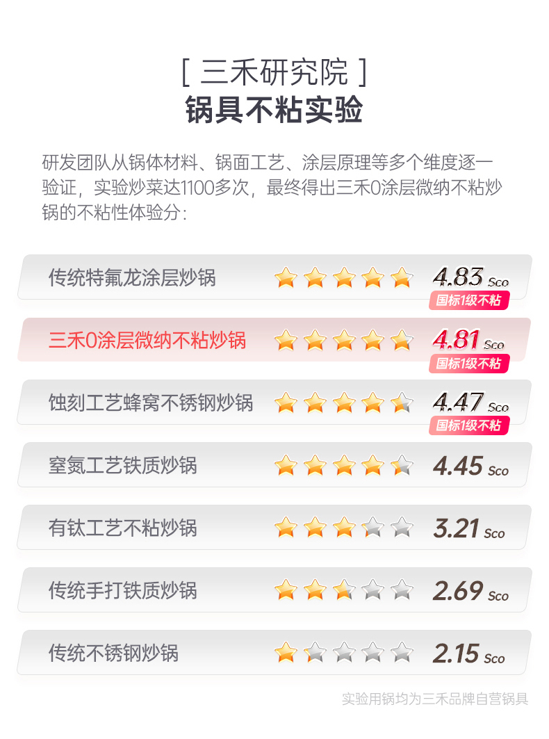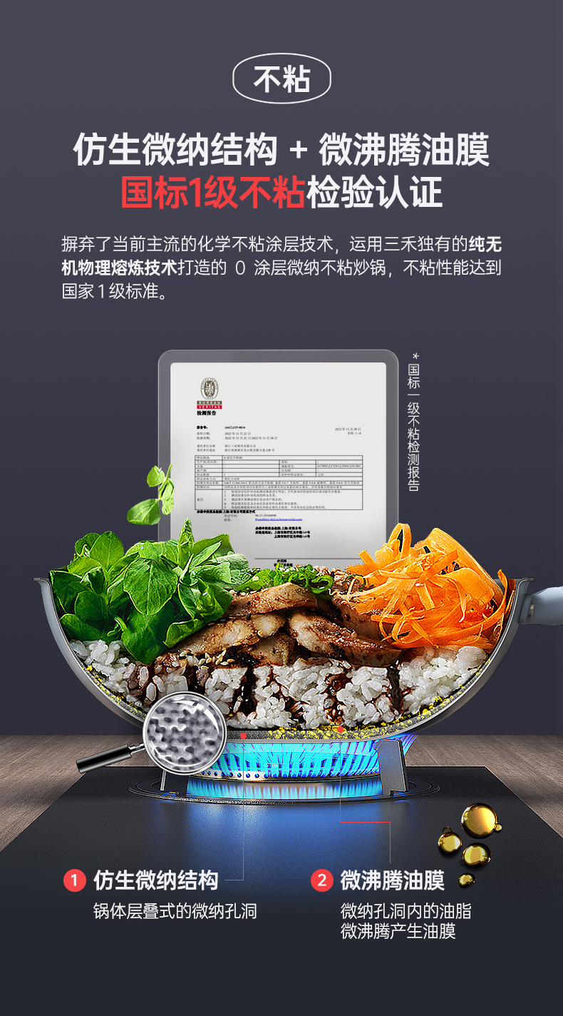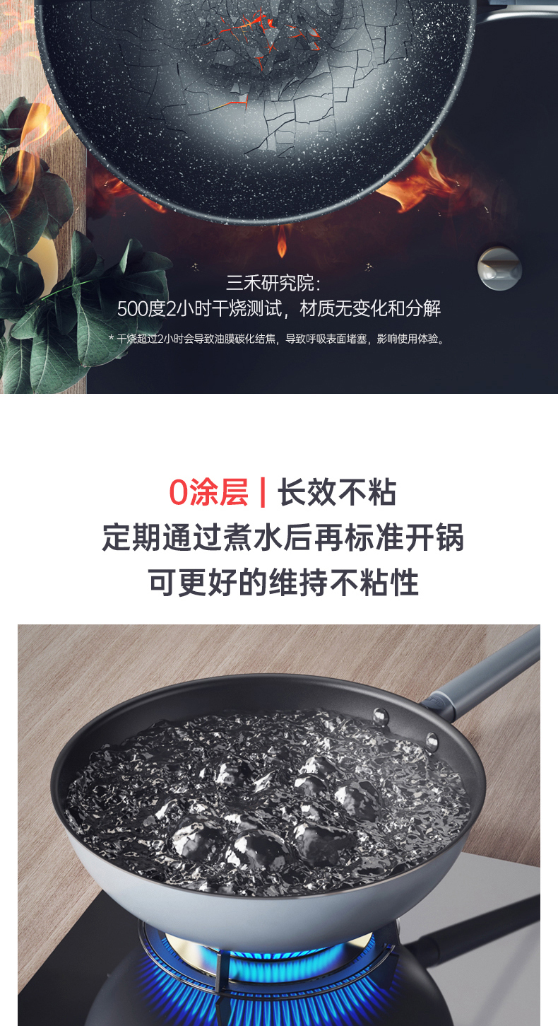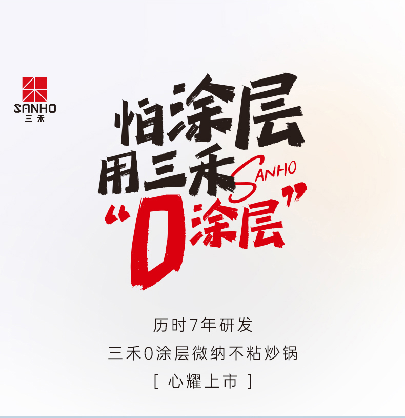 三禾0涂层」微纳不粘炒锅 和传统不粘锅相比做到没有化学涂层. 无惧钢铲随心爆炒,硬度达涂层锅4-5倍 高温不挥发任何有害物质,真正0涂层0氟0分解 0涂层高硬度,持久耐磨 0涂层不怕冷热冲洗,炒菜无需等待 0涂层,不怕干烧、烧不坏 高温不挥发任何有害物质,真正0涂层0氟0分解 轻量化设计,减重30%仅重1.13kg,轻松颠锅 不锈钢复底,电磁炉通用且不挑炉灶