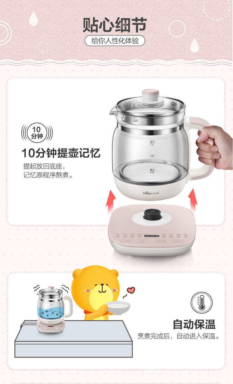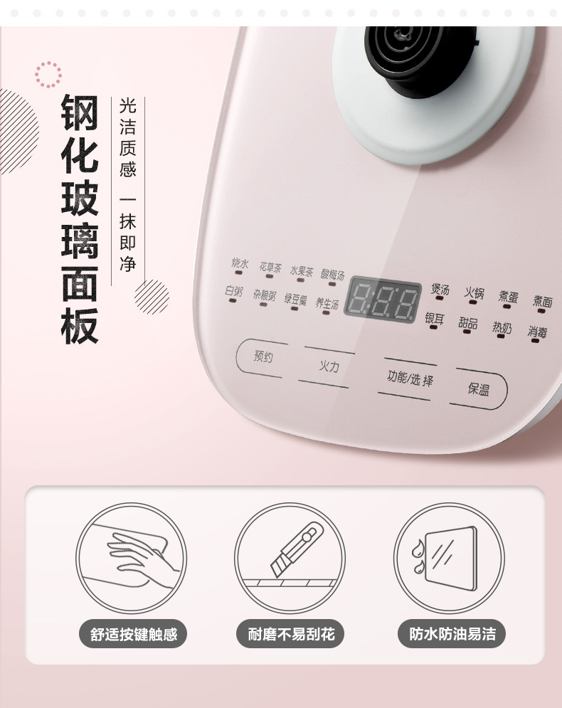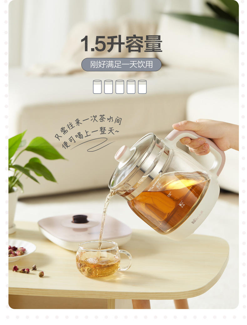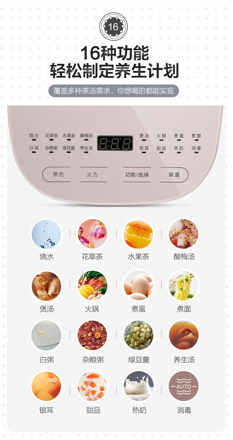 1.5L容量,微电脑预约定时 钢化玻璃面板材质,搭配触控操作 16大功能,花茶甜品随时享 304不锈钢滤网,高硼硅玻璃壶身 分体式结构/10分钟提壶记忆功能 防干烧断电保护,带蛋架和滤网