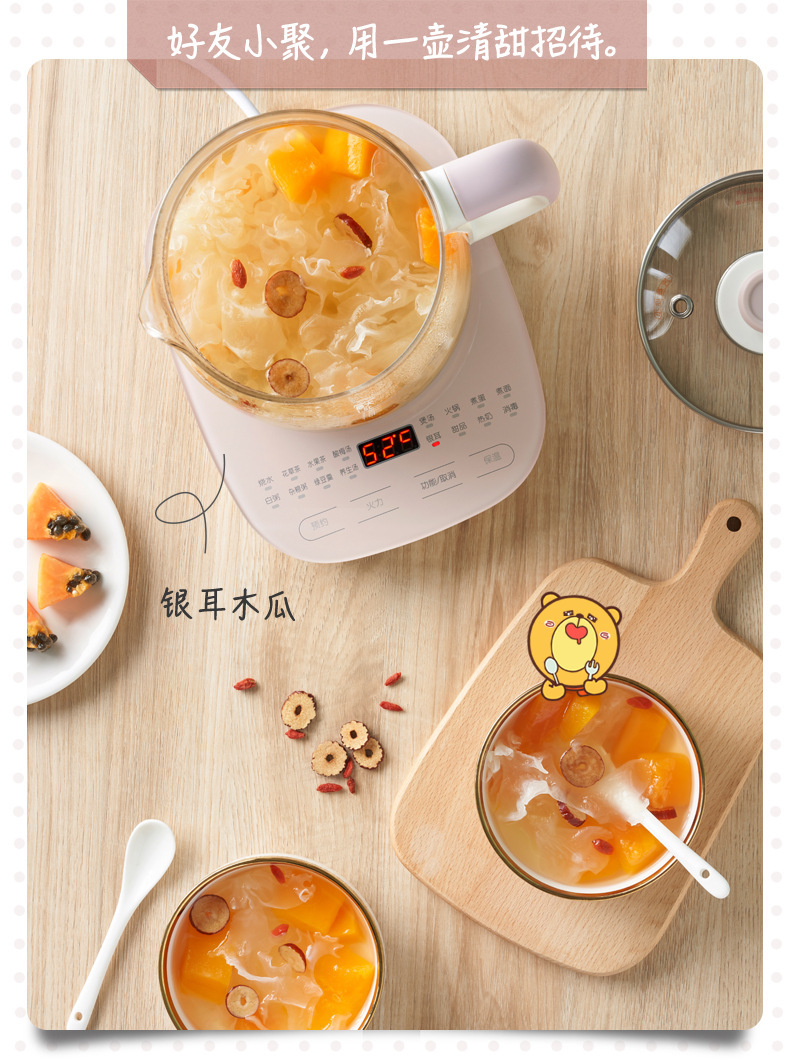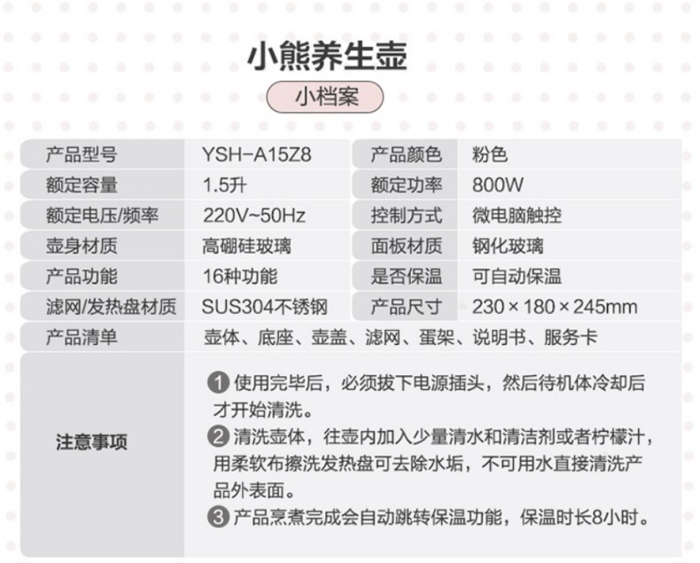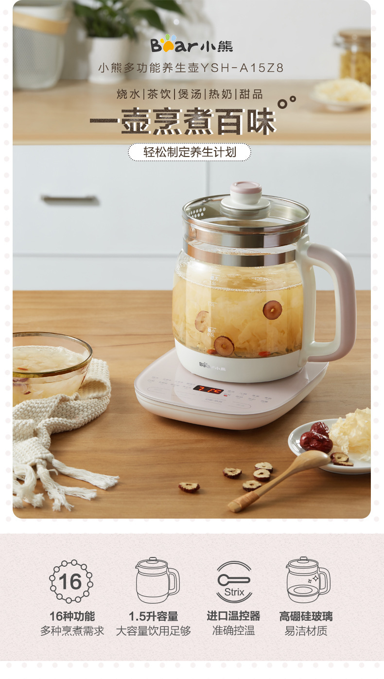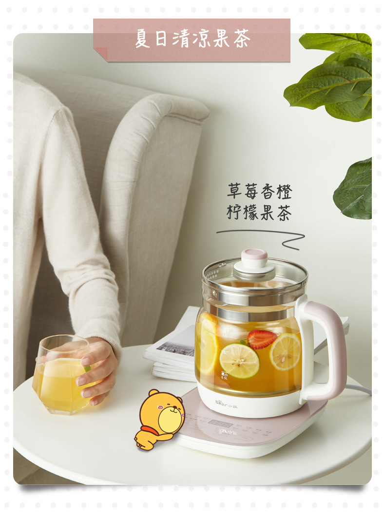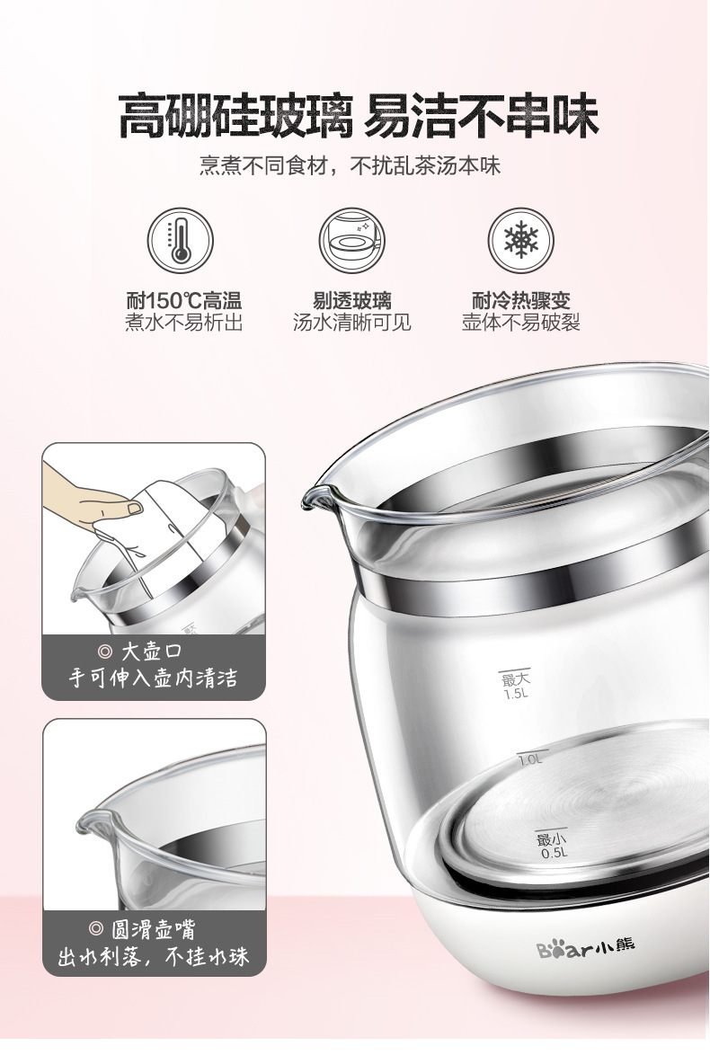 1.5L容量,微电脑预约定时 钢化玻璃面板材质,搭配触控操作 16大功能,花茶甜品随时享 304不锈钢滤网,高硼硅玻璃壶身 分体式结构/10分钟提壶记忆功能 防干烧断电保护,带蛋架和滤网