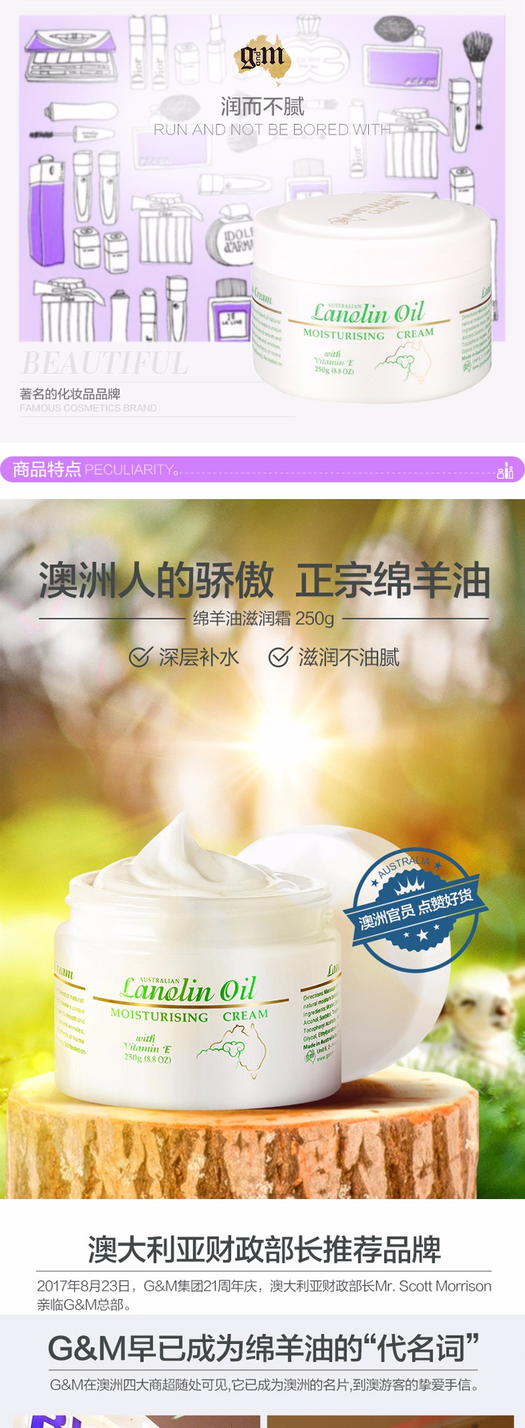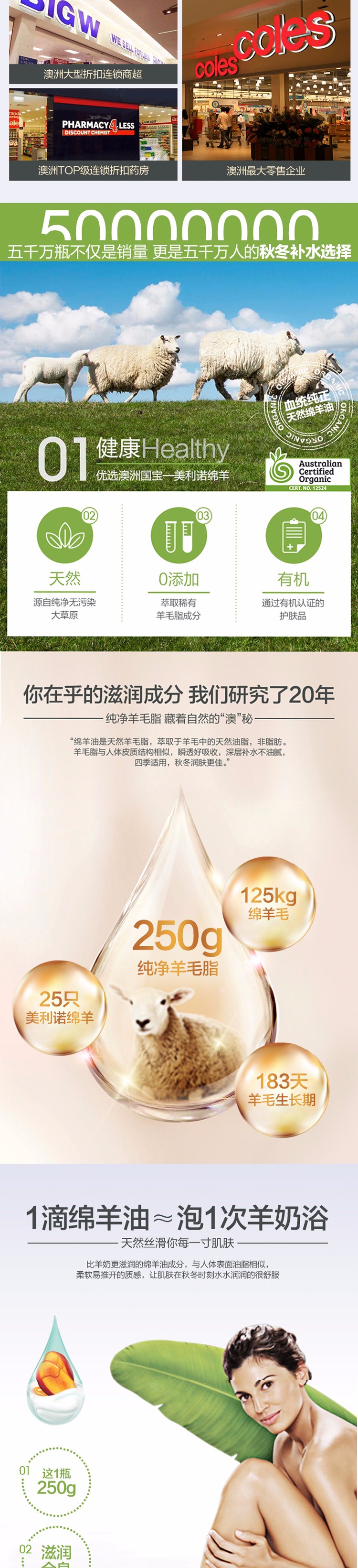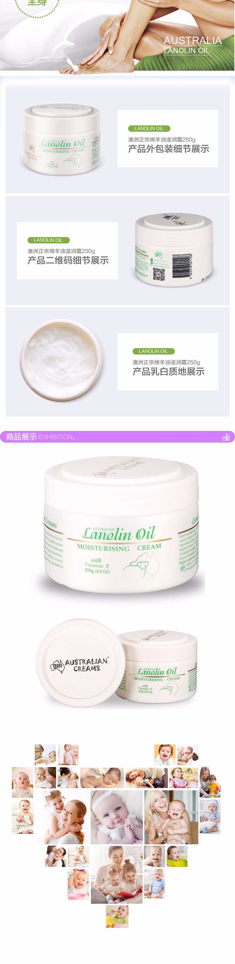 每罐250克。经皮肤专家临床试验证明,绵羊油可于28天内增加40%真皮层含水量,细胞密度增大。网状纤维变得密集而有弹性;连续使用绵羊油28天,可促生胶原蛋白200%,弹力蛋白增加3倍,基底细胞丰盈度增加2倍。持续使用绵羊油,可增强皮肤含水量,延缓衰老5年。