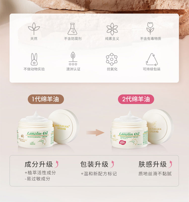 深度补水、滋润保养;澳洲绵羊脂,天然润肤剂;滋养保护肌肤,减少皱纹,特别适合干燥受损肌肤。