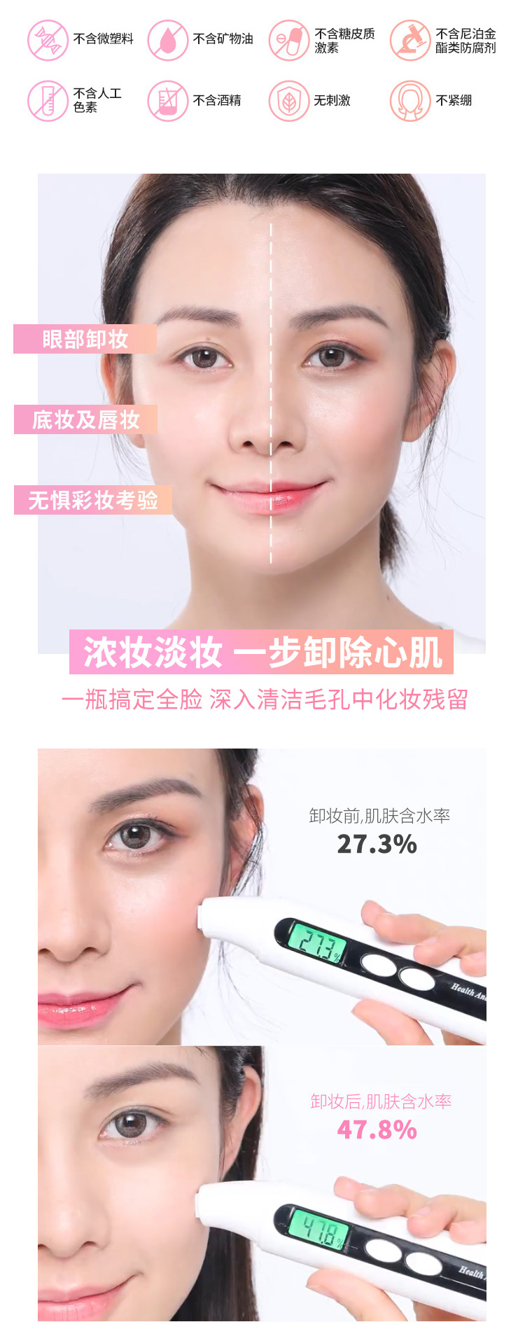 蕴含多种天然植萃精华成分,清洁、卸妆、舒润,三效合一