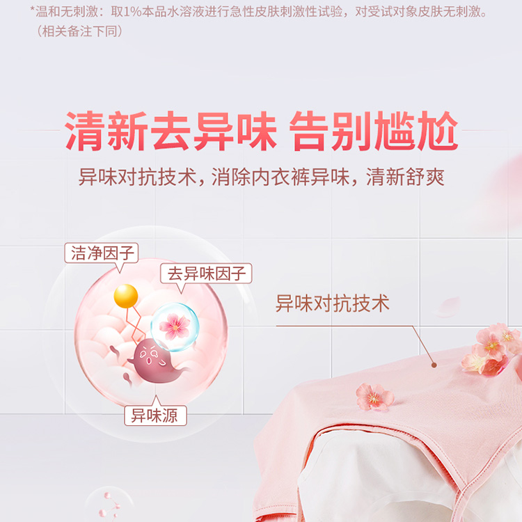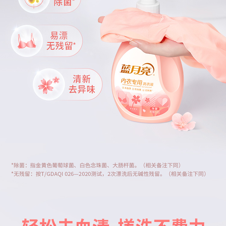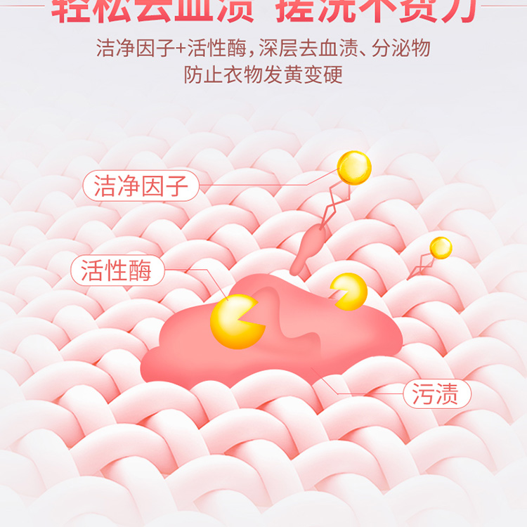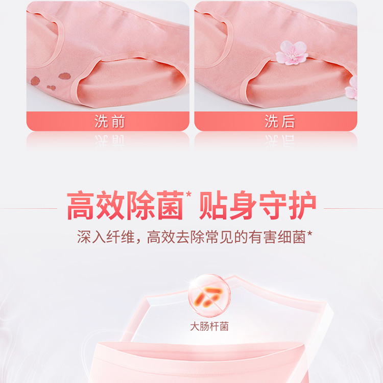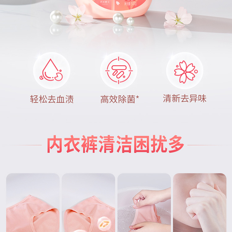 轻松去血渍、搓洗不费劲、高效除菌、贴身守护、温和易漂洗、无碱性残留、清新去异味、柔润樱花香