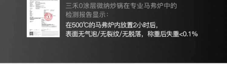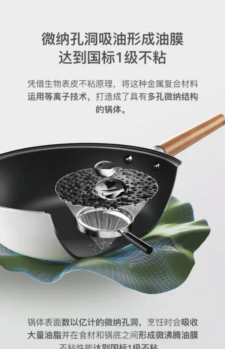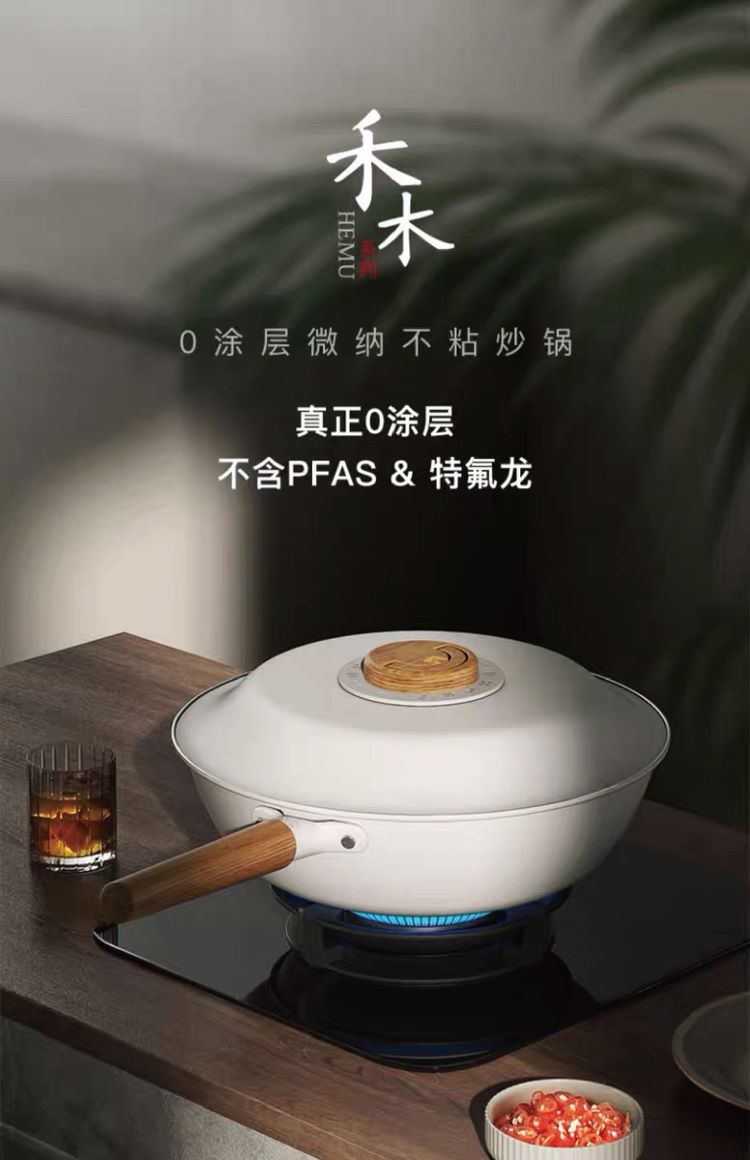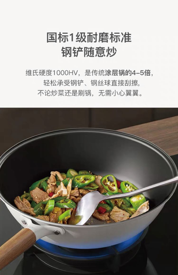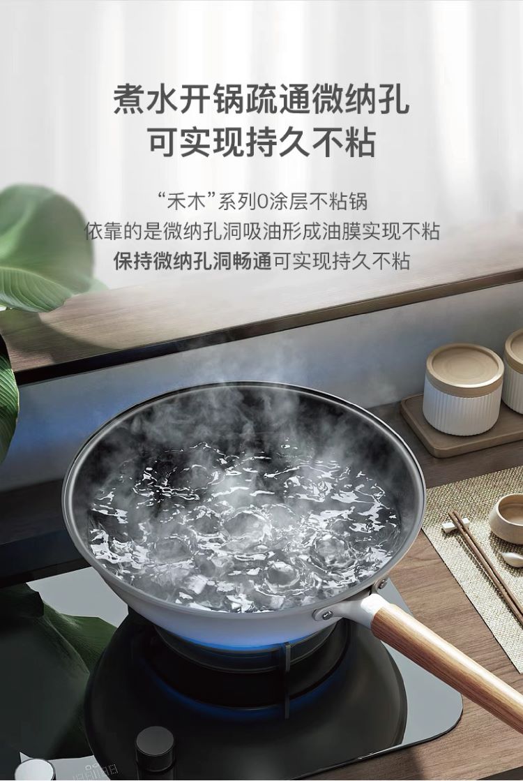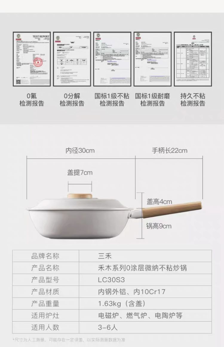 「三禾0涂层」不粘炒锅和传统不粘锅相比做到没有化学涂层.无惧钢铲随心爆炒,硬度达涂层锅4-5倍高温不挥发任何有害物质,真正0涂层0氟0分解 0涂层高硬度,持久耐磨 0涂层不怕冷热冲洗,炒菜无需等待 0涂层,不怕干烧、烧不坏 高温不挥发任何有害物质,真正0涂层0氟0分解 轻量化设计,减重30%仅重1.13kg,轻松颠锅 不锈钢复底,电磁炉通用且不挑炉灶 在烹饪时,食用油能够浸润仿生微纳结构表面,无需化学涂层即可将食材与锅表面隔绝开来,从而实现“0涂层不粘”效果,并兼具出色的耐磨性和防锈能力