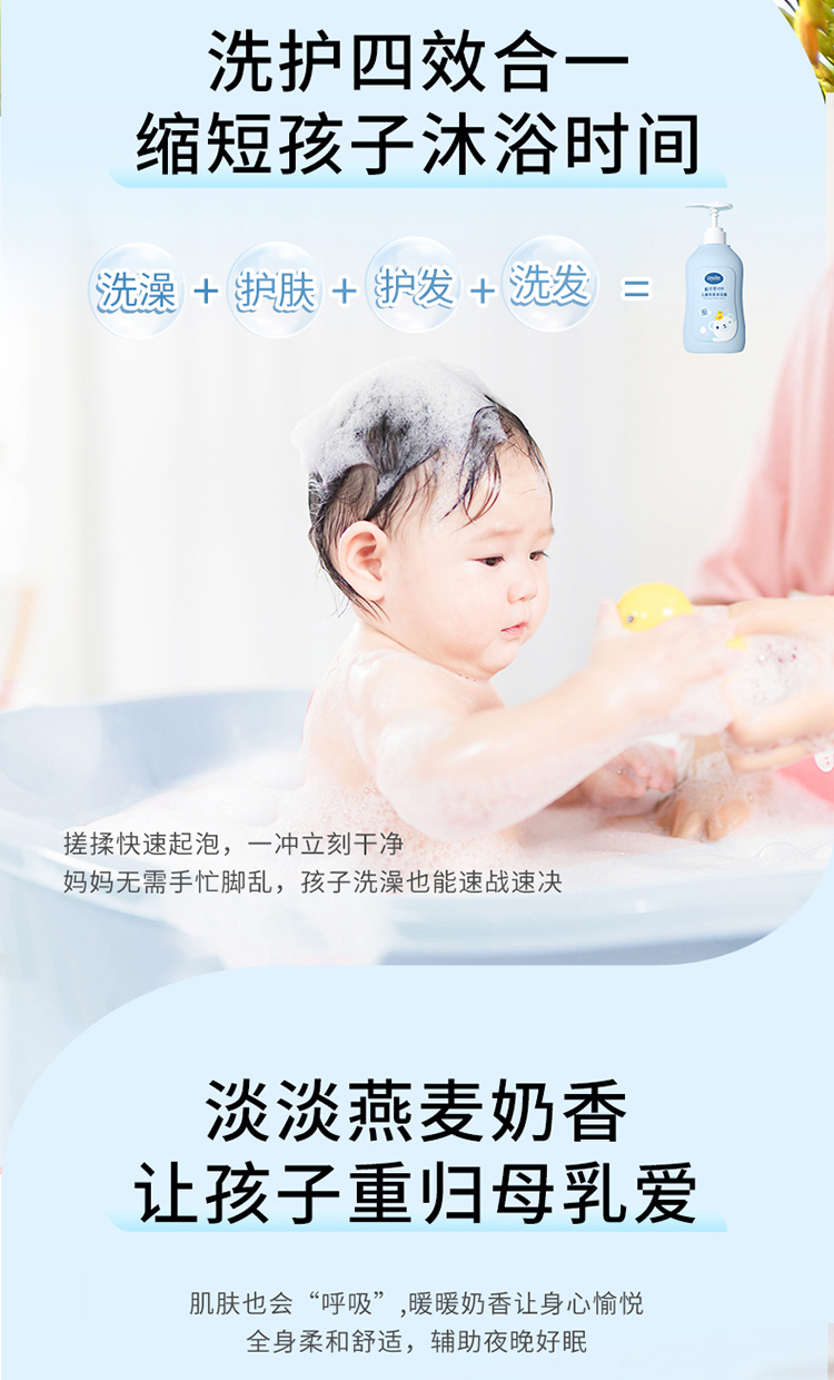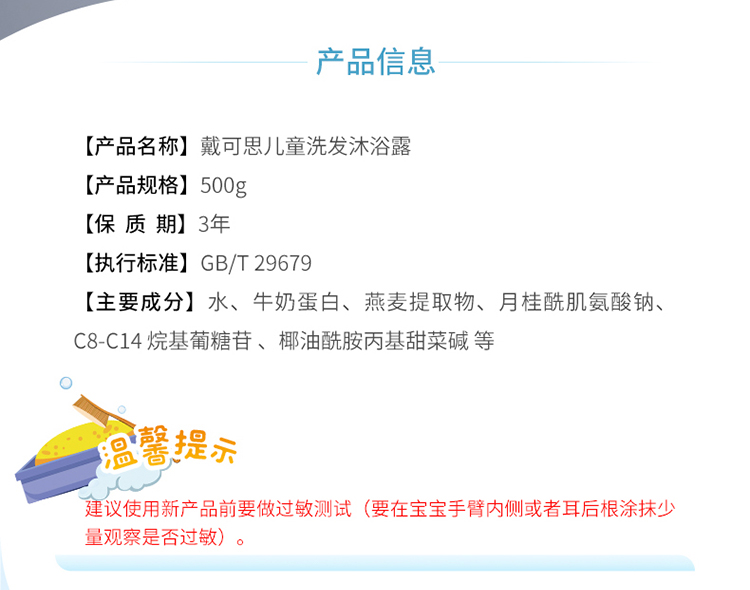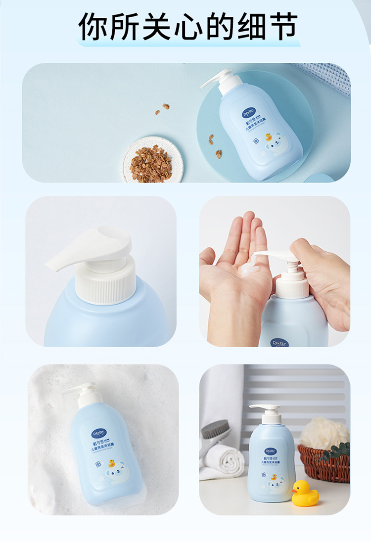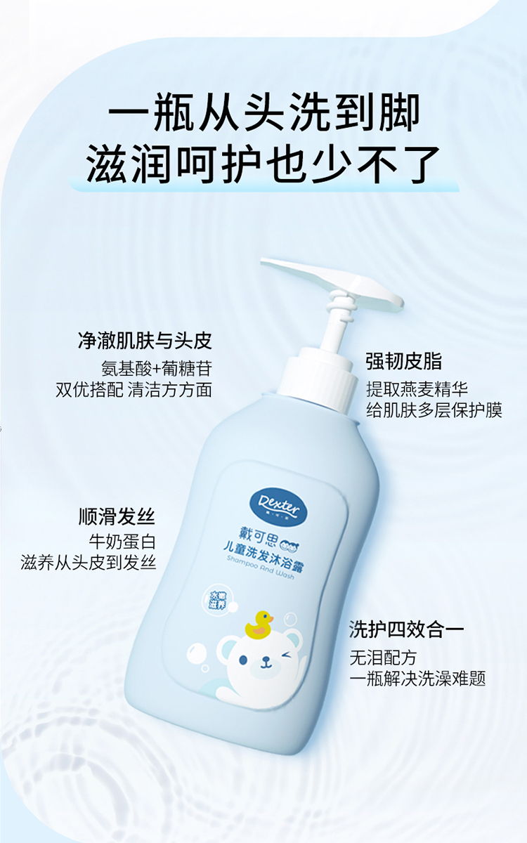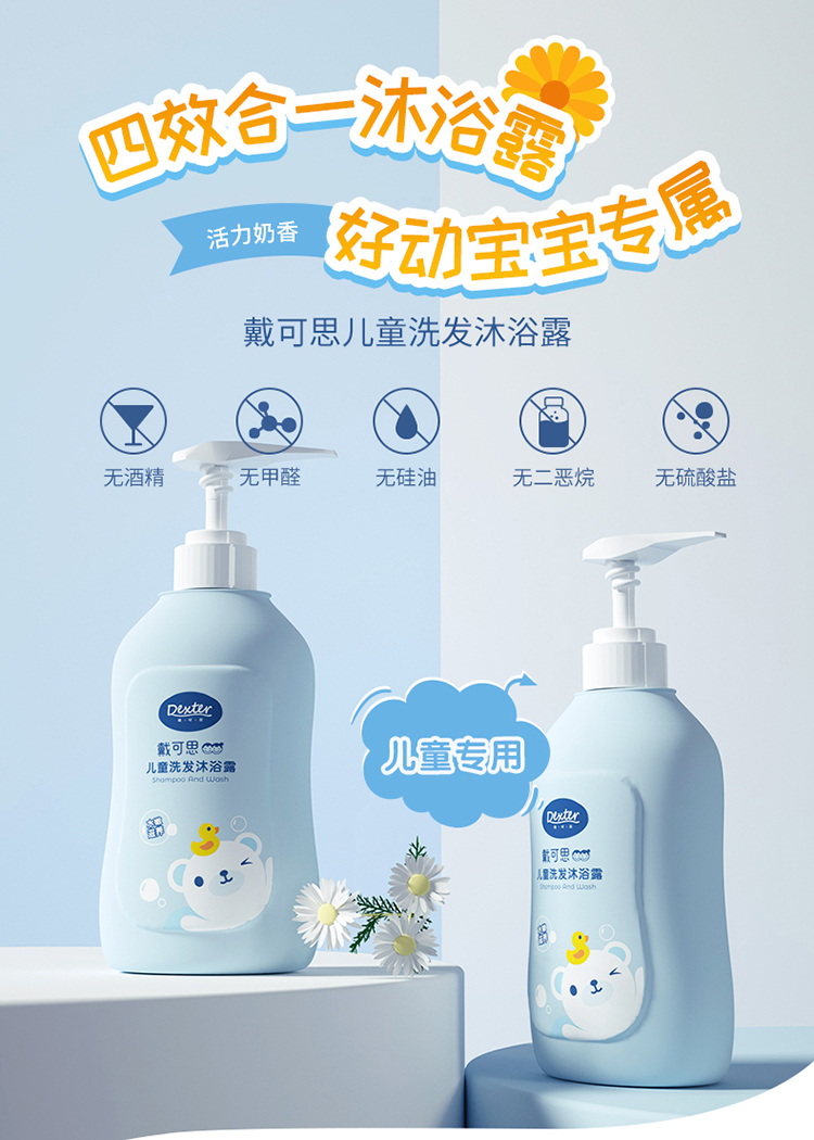 戴可思儿童洗发沐浴露,无酒精、甲醛、硅油,专为宝宝设计,洗护四效合一,无泪配方一瓶解决洗澡难题。提取燕麦精华,给肌肤多层保护膜。