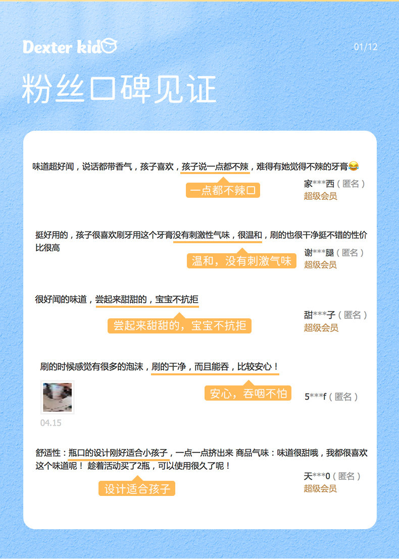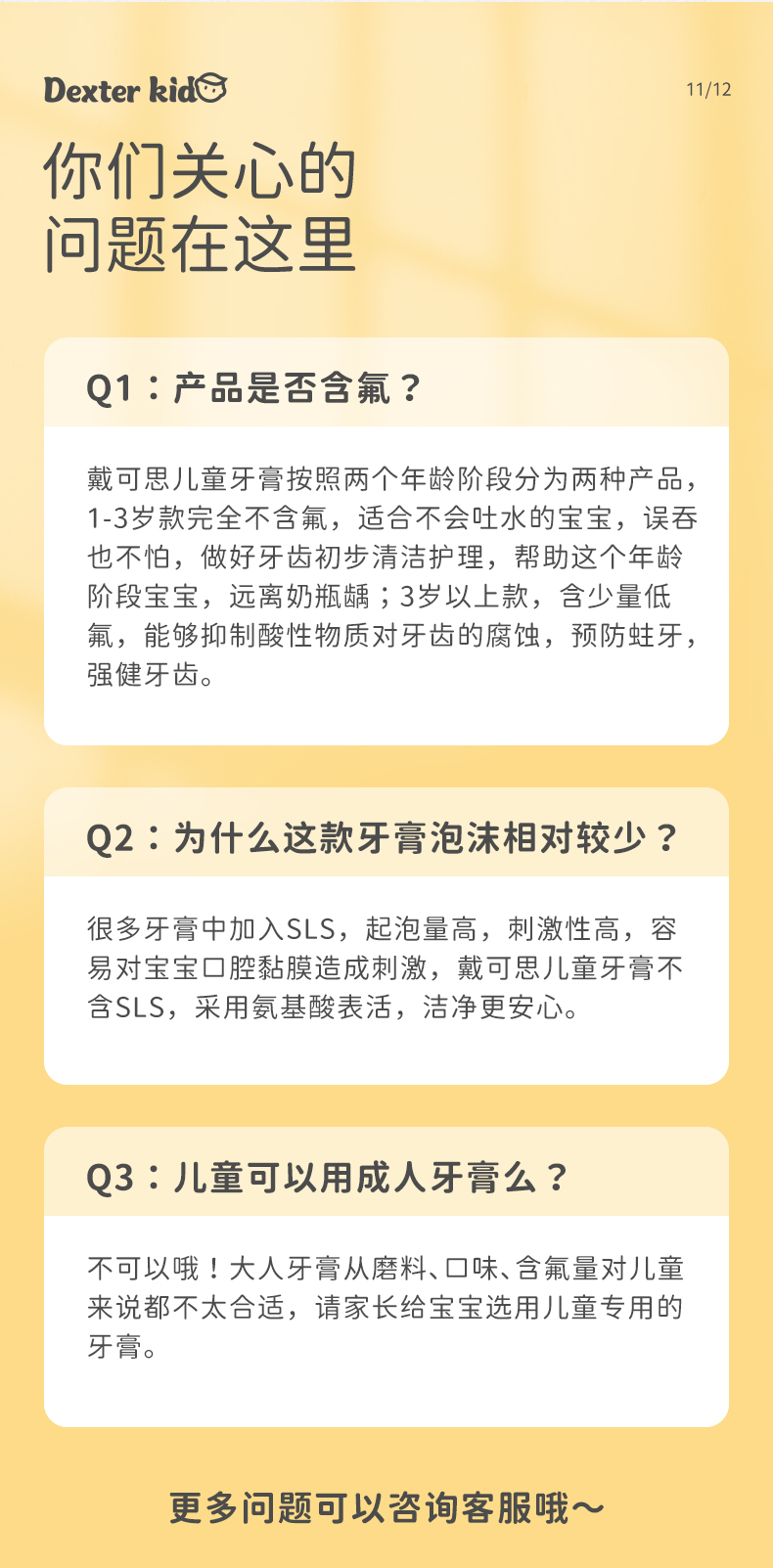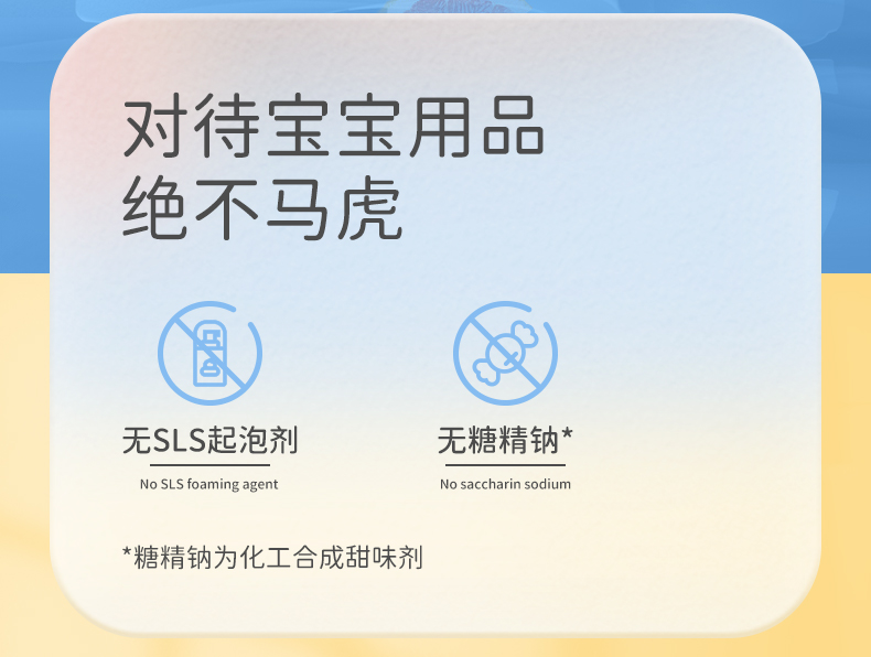 植物木糖醇,甜润不辣口,宝宝远离龋齿,温和低泡洁净,呵护口腔健康,专为宝宝研发。