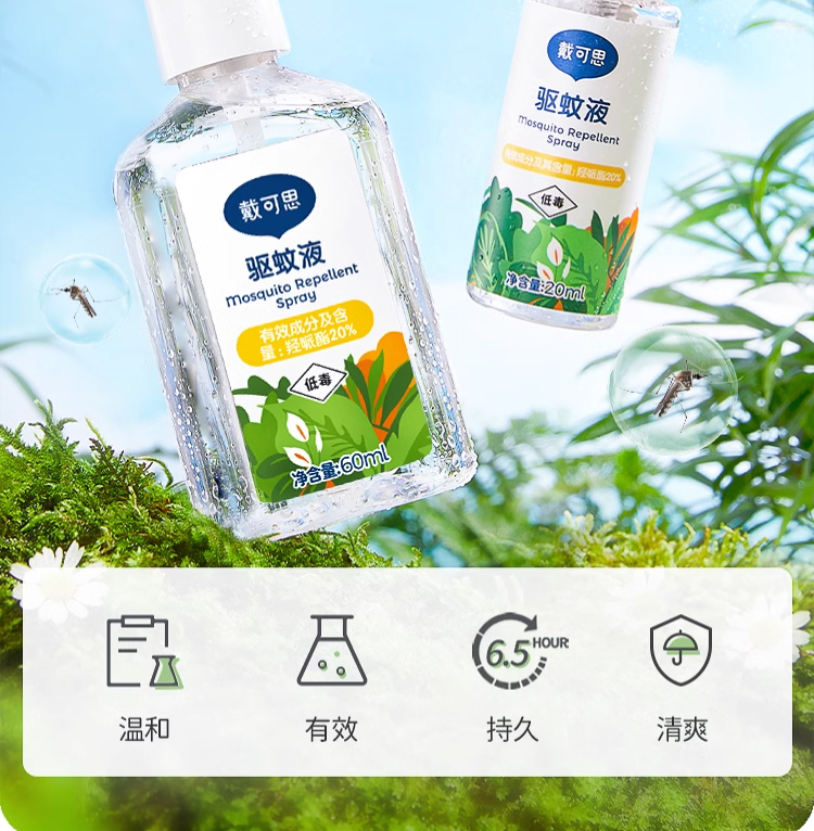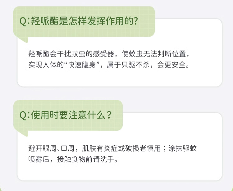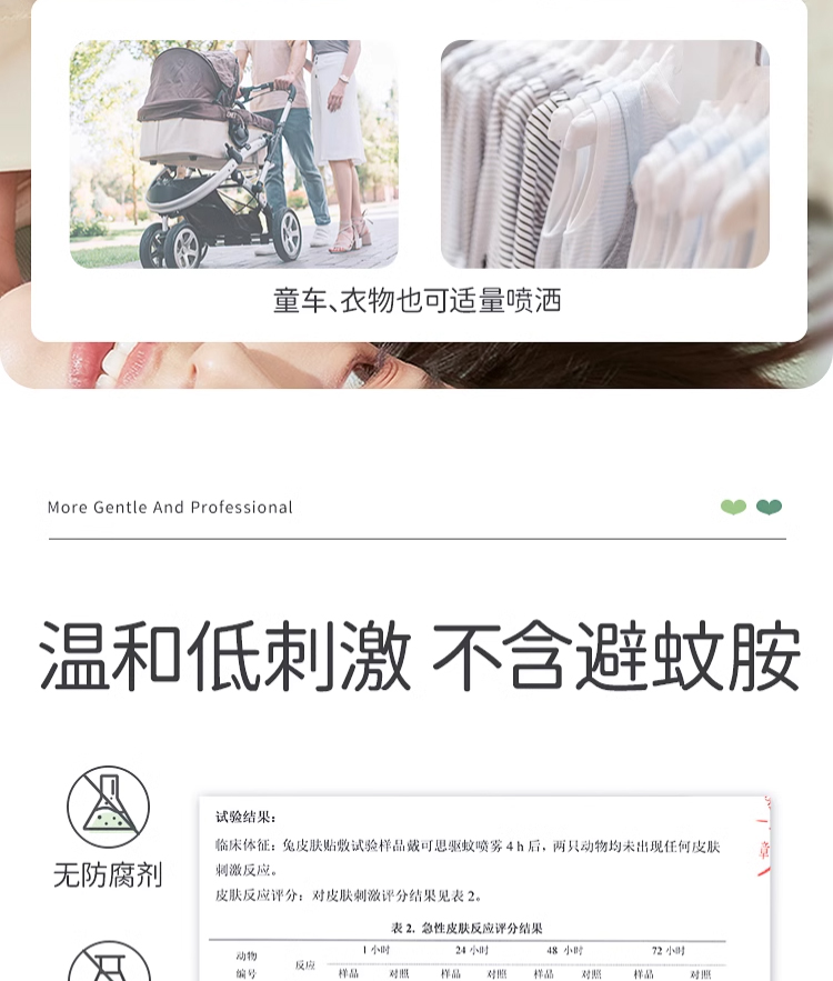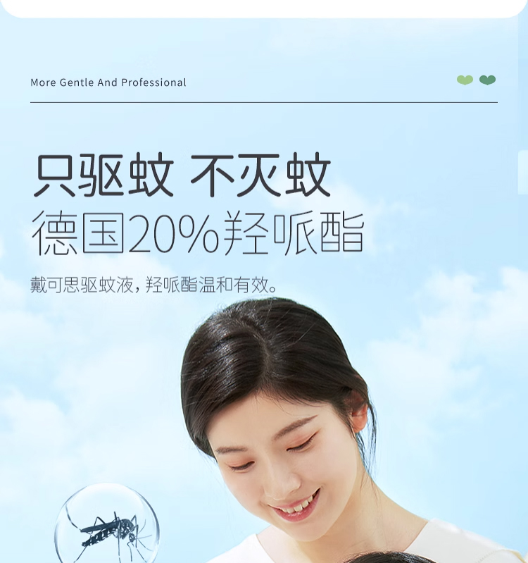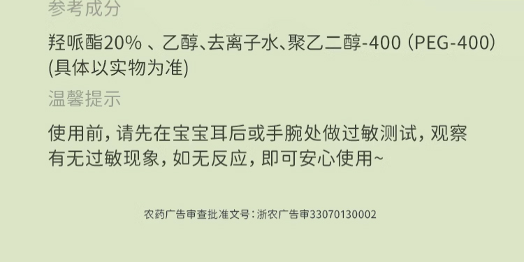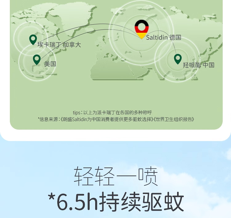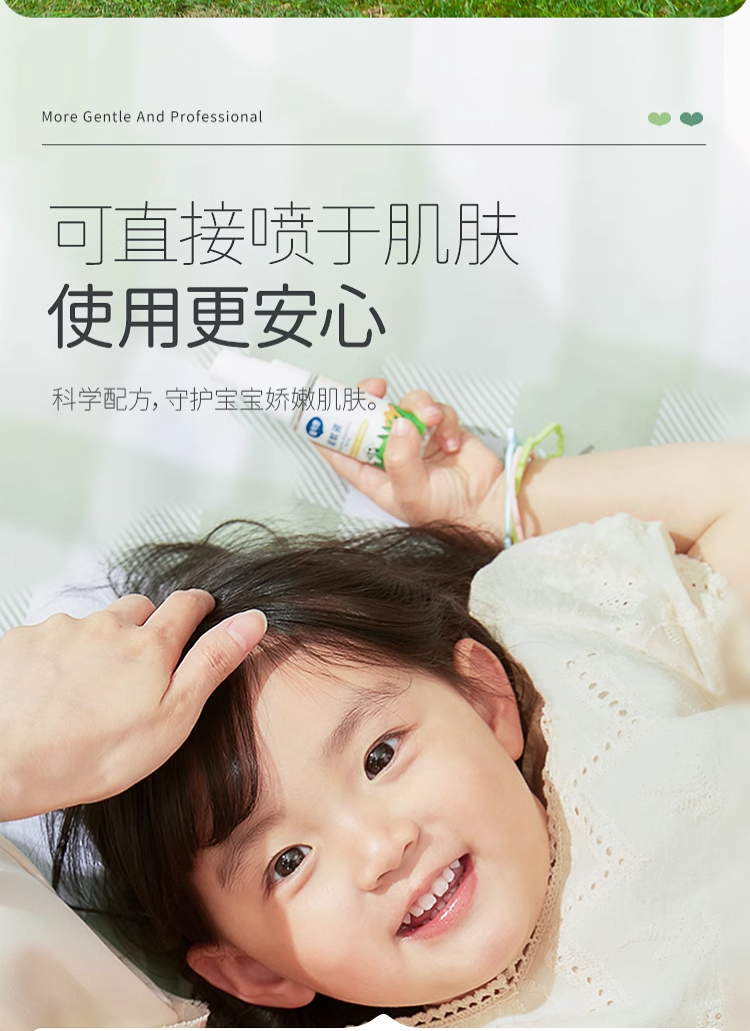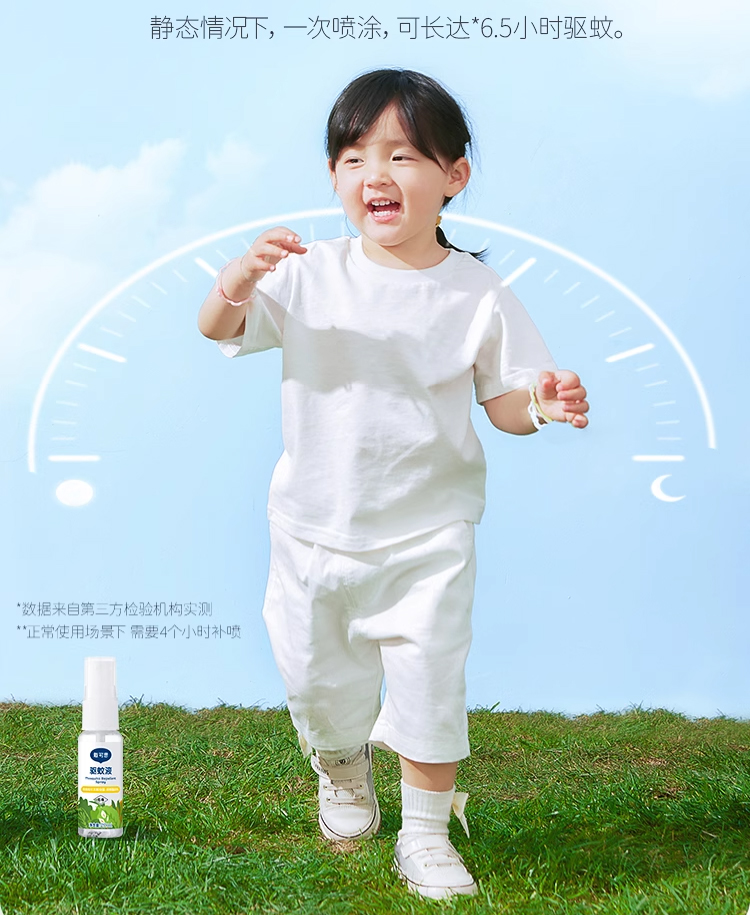 添加德国进口派卡瑞丁,派卡瑞丁相对是综合驱蚊有效性和使用温和性之后较优的选择,更适合孕婴使用。一次喷涂长效驱蚊6.5h,肌肤低刺激,不含避蚊胺,温柔守护1岁+宝宝娇嫩肌肤。