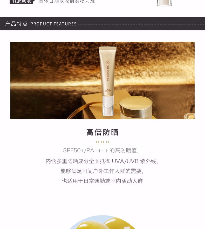 内含多重防晒成分全面抵御 UVA/UVB紫外线,能够满足日间户外工作人群的需要