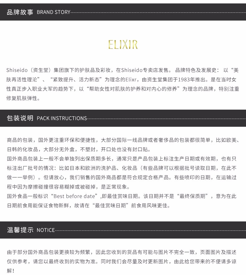 ELIXIR怡丽丝尔, 1983年诞生于日本,是资生堂 集团的肌肤抗老化品牌,拥有资生堂先端抗老化技术,品牌名ELIXIR来自法语,有“精华”、"精粹"之意。