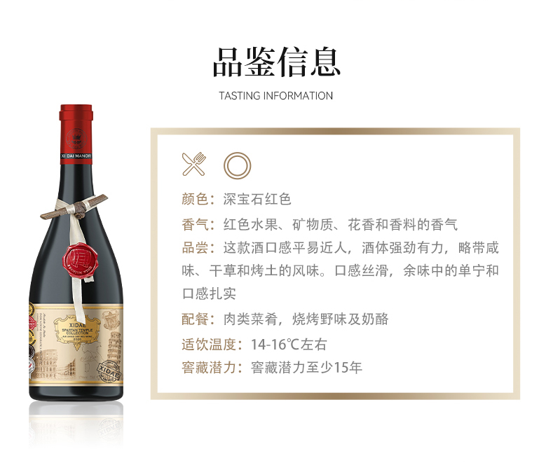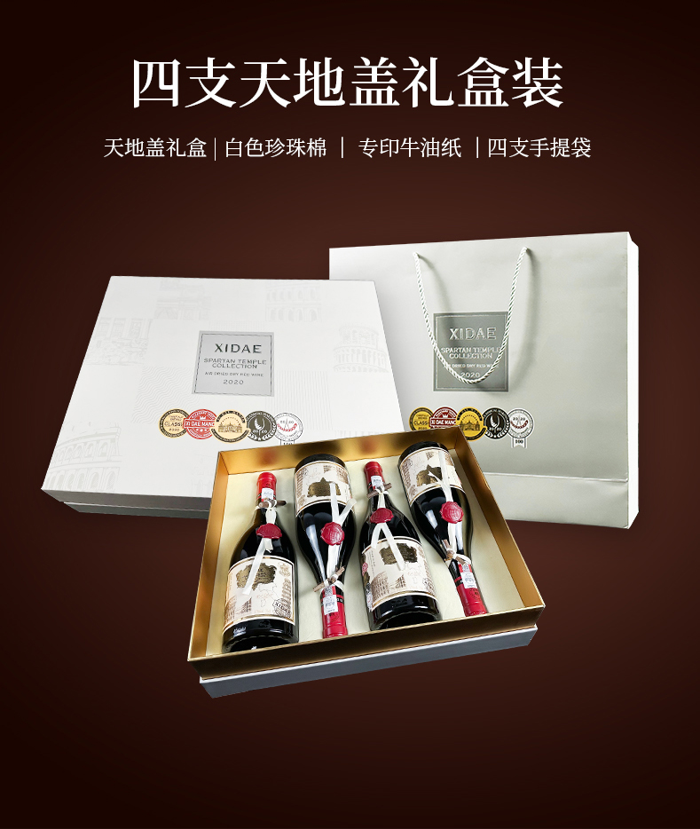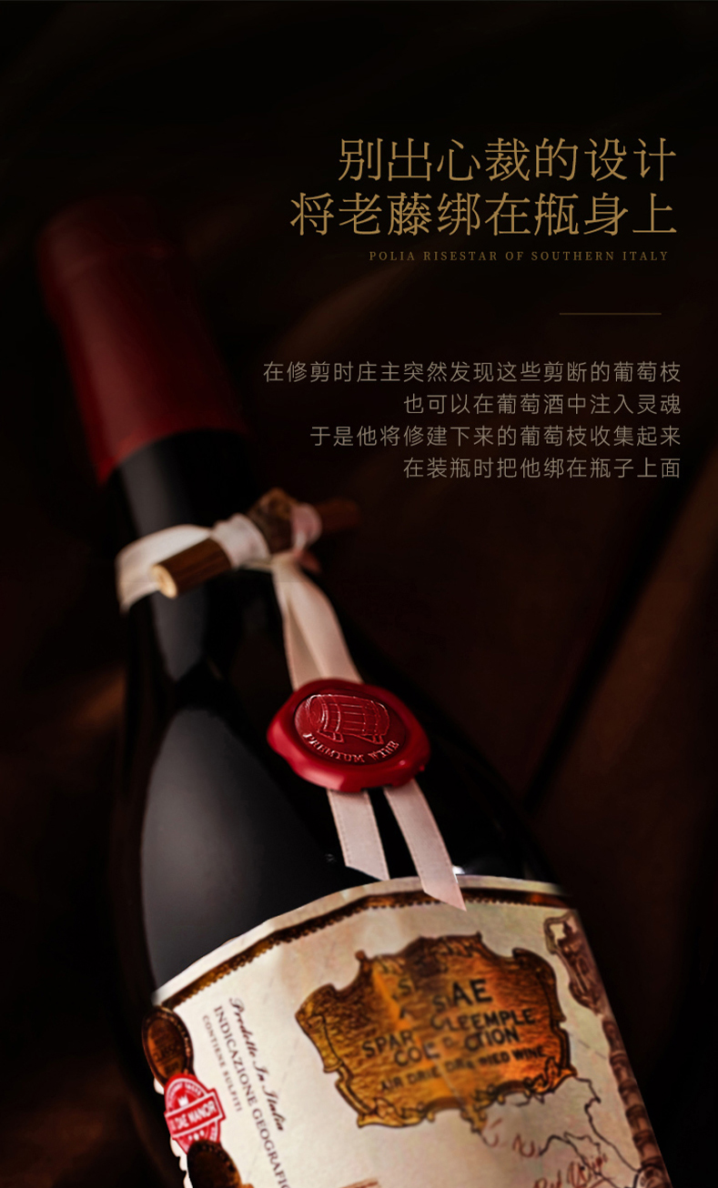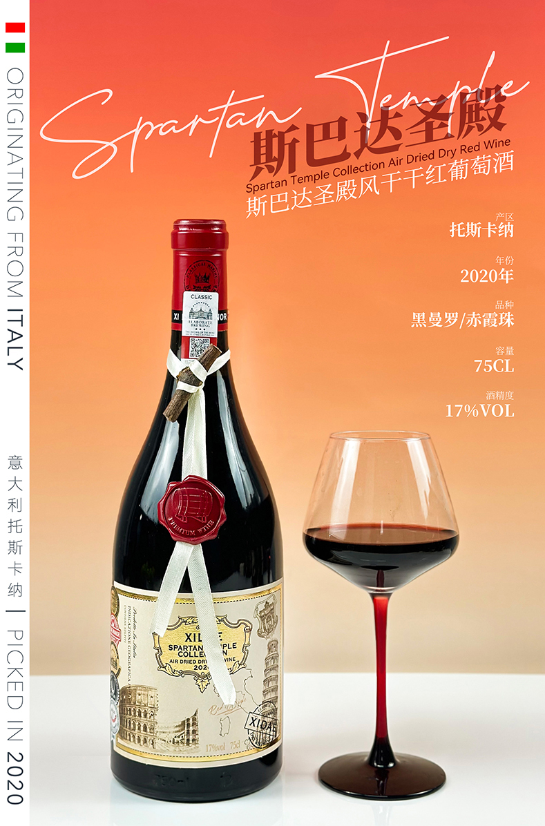 1.SPARTAN TEMPLE COLLECTION 斯巴达圣殿珍藏风干葡萄酒,意大利原瓶进口区,超高扫码价5988元;2.自然发酵天花板17度,葡萄采摘年份2020年,正品防伪:瓶口处正品防伪码,葡萄品种:黑曼罗 赤霞珠 双珠混酿。特色老藤枝留念:人工剪切、一瓶一藤;3.丝巾吊绳+橡木桶蜡标logo 精美礼盒装:天地盖礼盒+牛油纸+手提袋,勃肯第加重瓶,深凹槽,耐陈年,百年老藤自然风干,窖藏潜力至少15年,最佳饮用温度: 14-16度,包装规格 1箱*4盒*4瓶。