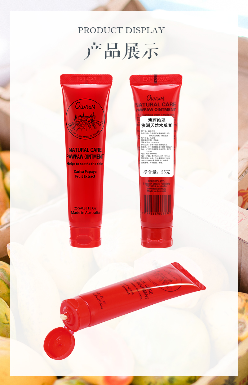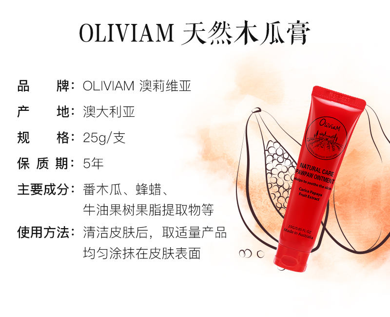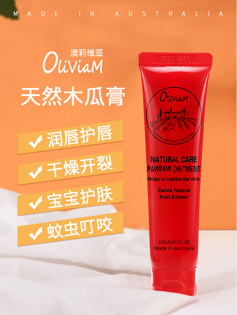 每支25克。澳人喜爱的oliviam澳莉维亚,几乎人手一个。一膏多用,人称万用木瓜膏!可做护唇膏,防干裂很有效。可做面霜,滋润效果很好。可做护手/足霜,防止干裂。口角炎,木瓜膏!鞋子磨脚,木瓜膏!蚊虫叮咬,还是木瓜膏!