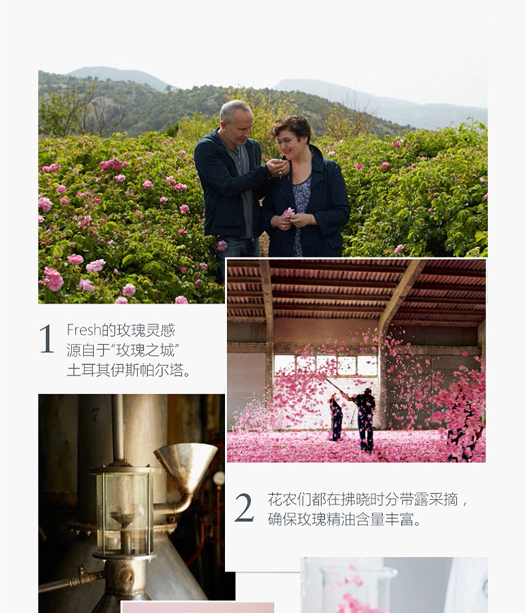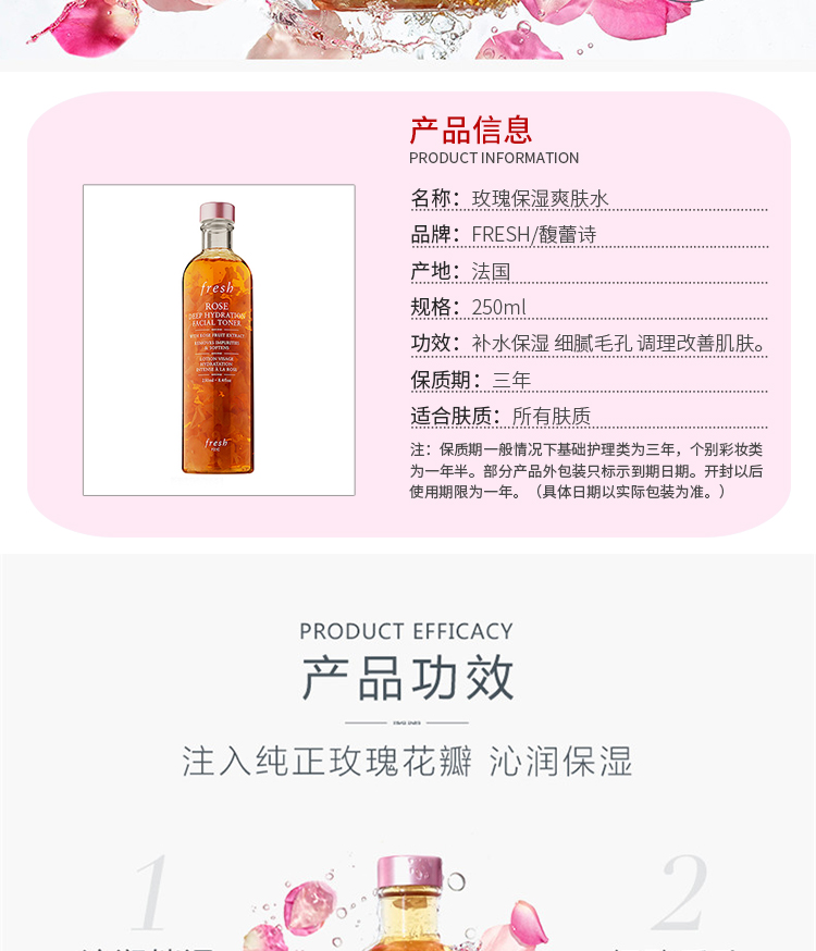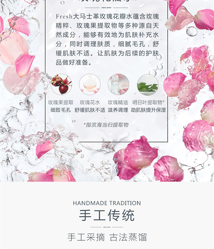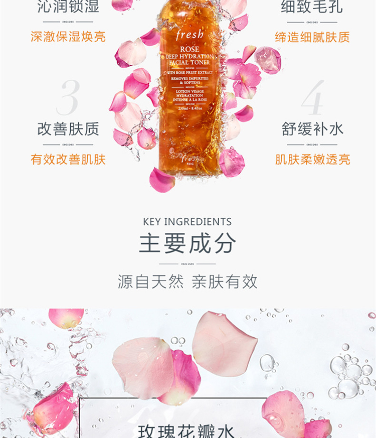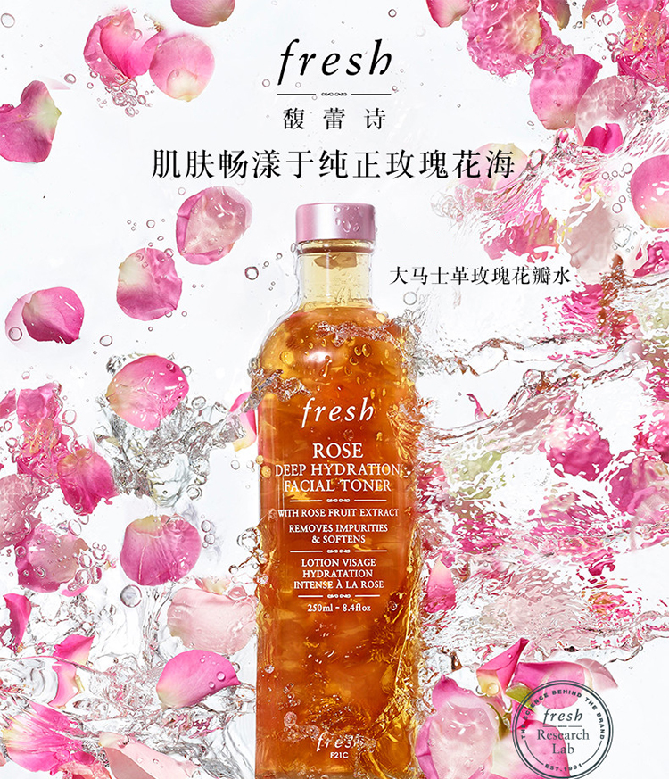 Fresh玫瑰深層保濕柔膚水與同系列的其它產品一樣,它所選用的玫瑰都源自有「玫瑰之都」稱號的土耳其城市伊斯巴達。柔膚水呈無酒精的水潤配方,帶來高效超凡的護膚功效,適合任何膚質使用。成分注入玫瑰花瓣配方溫和,有效清除環境污染物以及肌膚表面雜質