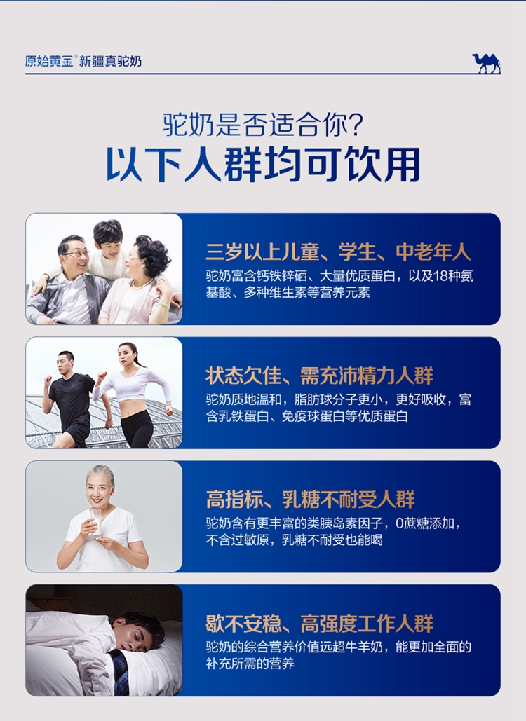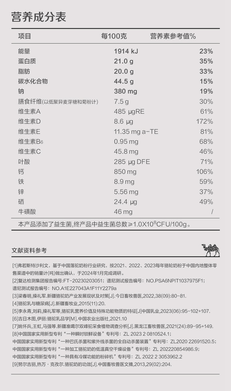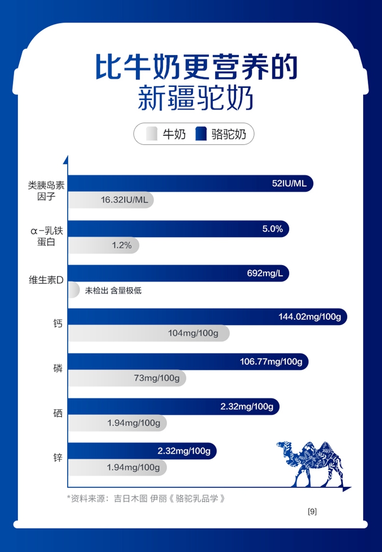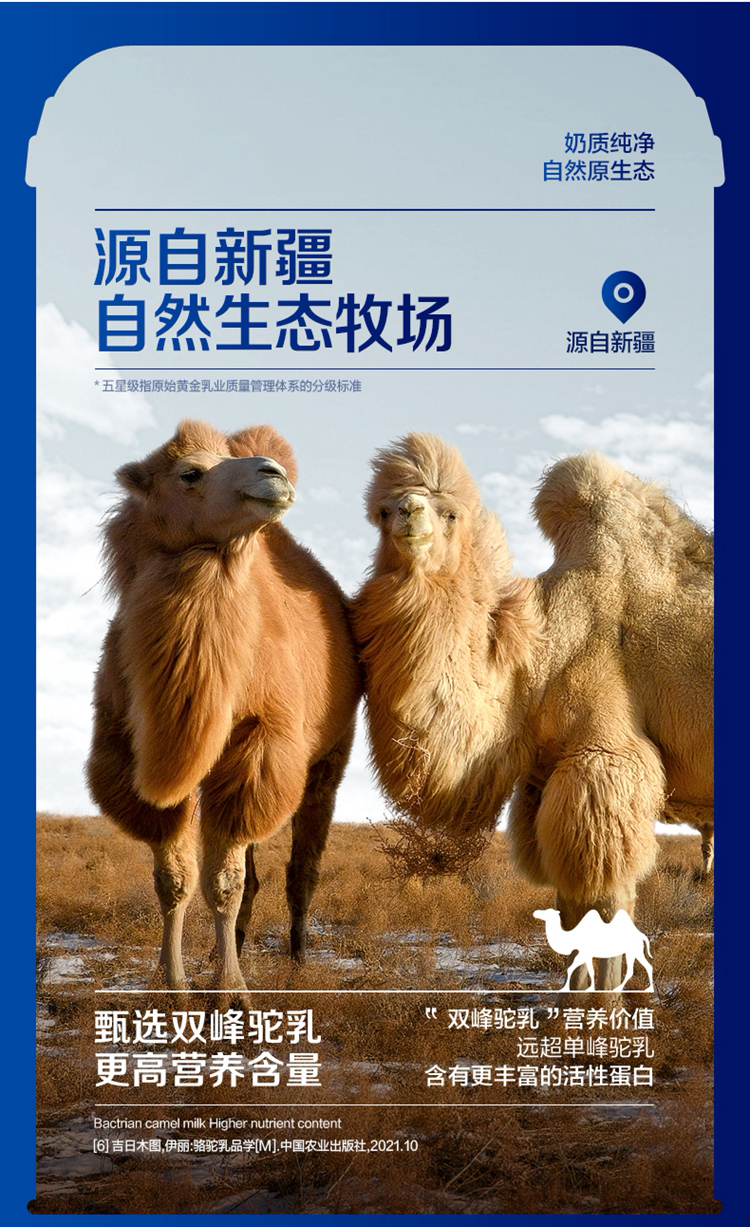 ①特别添加益生菌,补充营养; ②加入菊粉,膳食纤维高,骆驼奶中含有多种维生素和微量元素; ③含有十八种氨基酸;富含免疫球蛋白、类胰岛素生长因子、乳铁传递蛋白等等; ④驼奶含量符合国家标准,并且比牛奶更易吸收,乳糖不耐受放心喝;