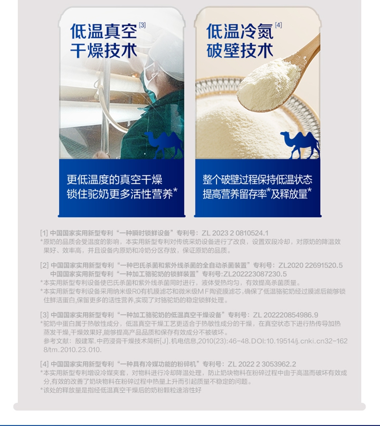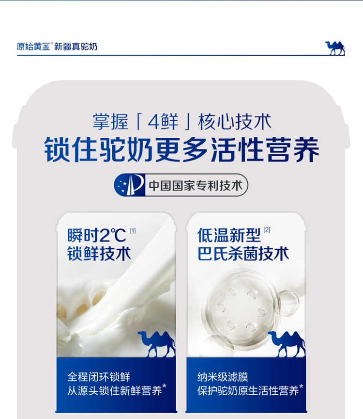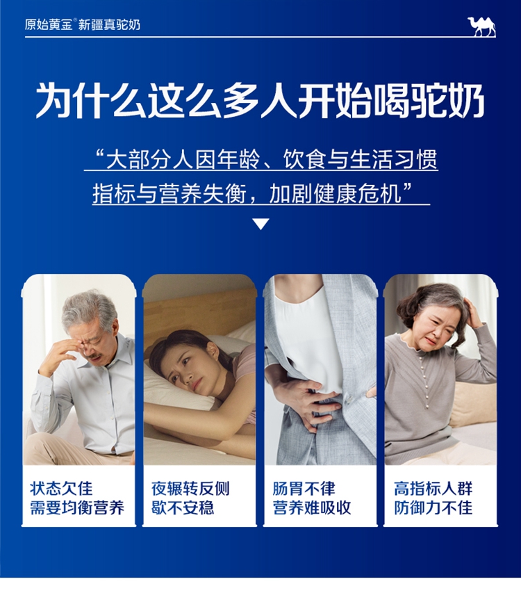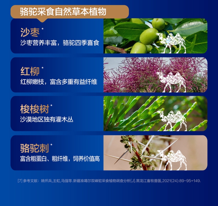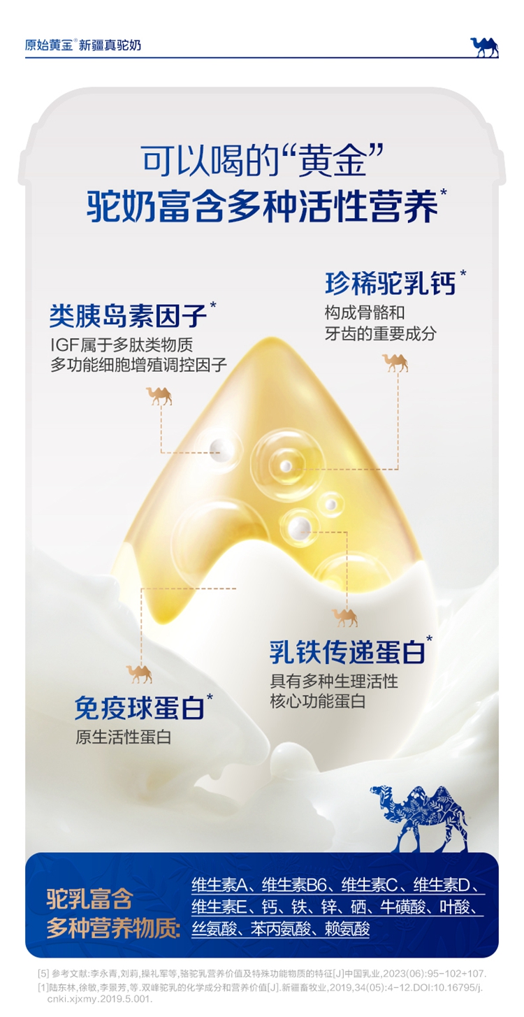 ①特别添加益生菌,补充营养; ②加入菊粉,膳食纤维高,骆驼奶中含有多种维生素和微量元素; ③含有十八种氨基酸;富含免疫球蛋白、类胰岛素生长因子、乳铁传递蛋白等等; ④驼奶含量符合国家标准,并且比牛奶更易吸收,乳糖不耐受放心喝;