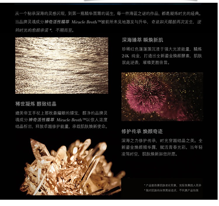 品牌的诞生,始于麦克斯•贺伯博士在实验室遭遇的意外,唤起他对修护容颜的探索之旅。 白天,他仍是一名太空物理学家,而夜幕降临,则化身逐梦者。怀着破解修护能量的愿望,他将目光投向挚爱的海洋。历经12载,6000次试验,博士终获令其受益终生的顿悟,从深海巨藻和其他精纯成分中发酵萃炼出海蓝之谜品牌的灵魂成分、修护秘方——神奇活性精萃Miracle Broth™,最终焕变他的肌肤。