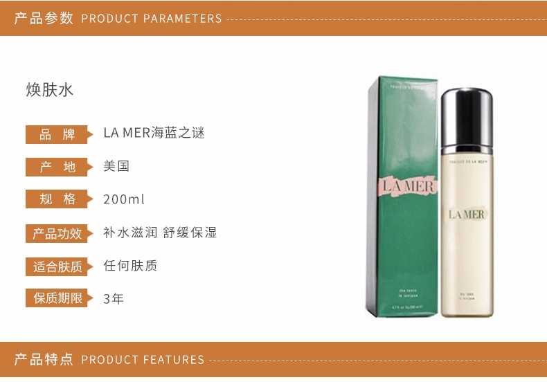 海蓝之谜(LA MER)焕肤水 200ml,富含舒缓并调理肌肤、能够大程度地吸收后续护肤品的有益成分。注入犹他州含高山胶原矿物质的纯净矿泉水,提供肌肤保湿作用。令肌肤重现晶莹亮泽。