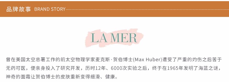品牌的诞生,始于麦克斯•贺伯博士在实验室遭遇的意外,唤起他对修护容颜的探索之旅。 白天,他仍是一名太空物理学家,而夜幕降临,则化身逐梦者。怀着破解修护能量的愿望,他将目光投向挚爱的海洋。历经12载,6000次试验,博士终获令其受益终生的顿悟,从深海巨藻和其他精纯成分中发酵萃炼出海蓝之谜品牌的灵魂成分、修护秘方——神奇活性精萃Miracle Broth™,最终焕变他的肌肤。