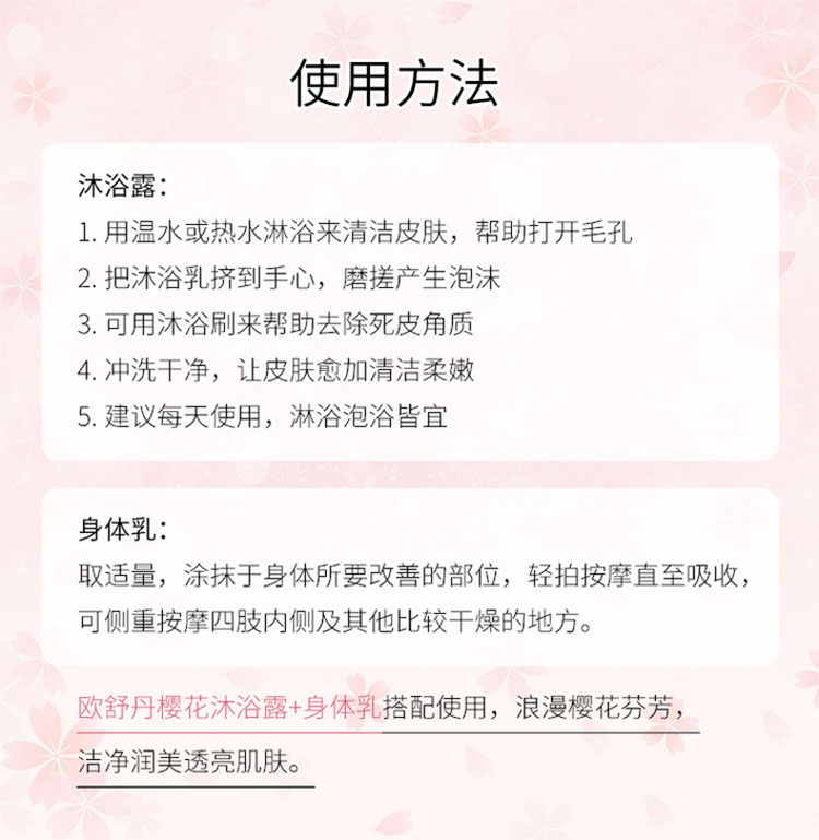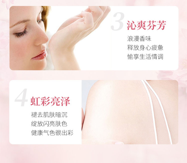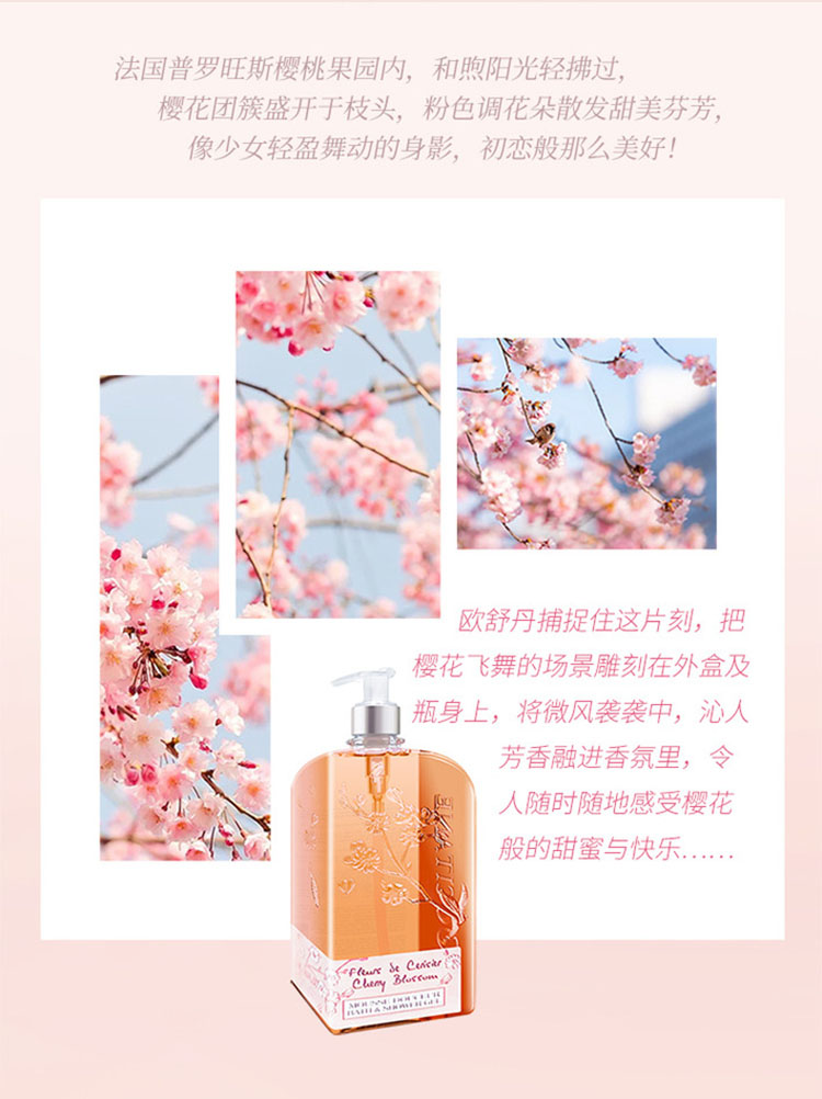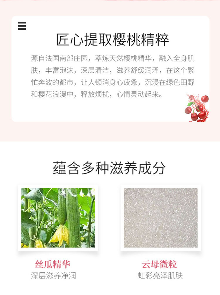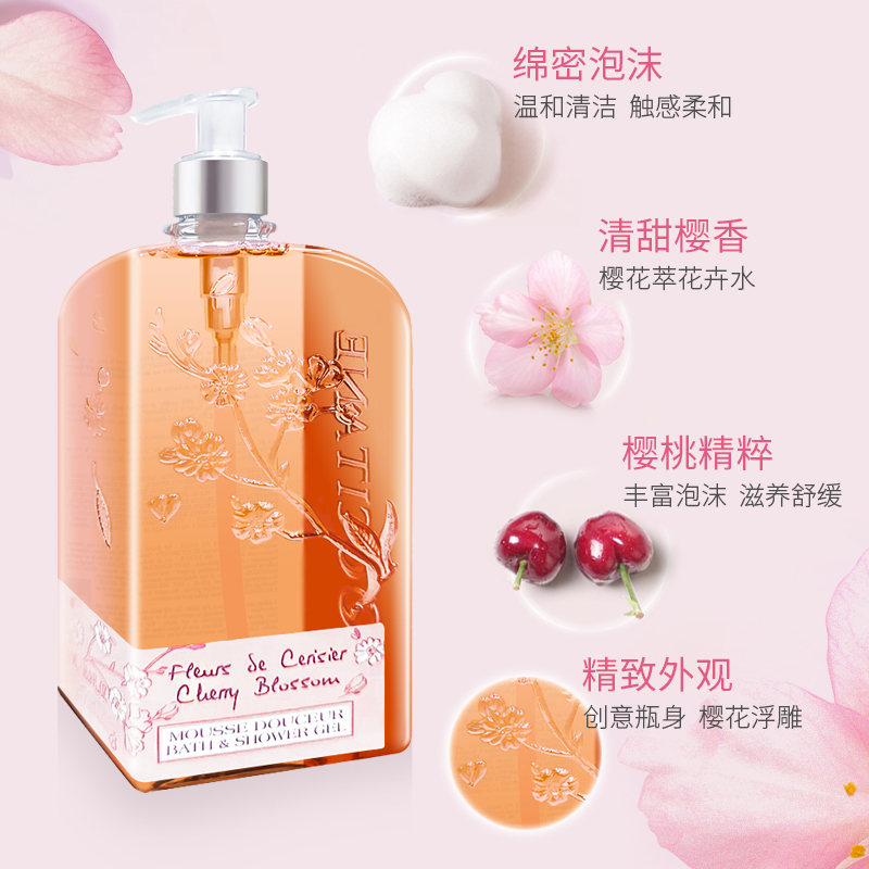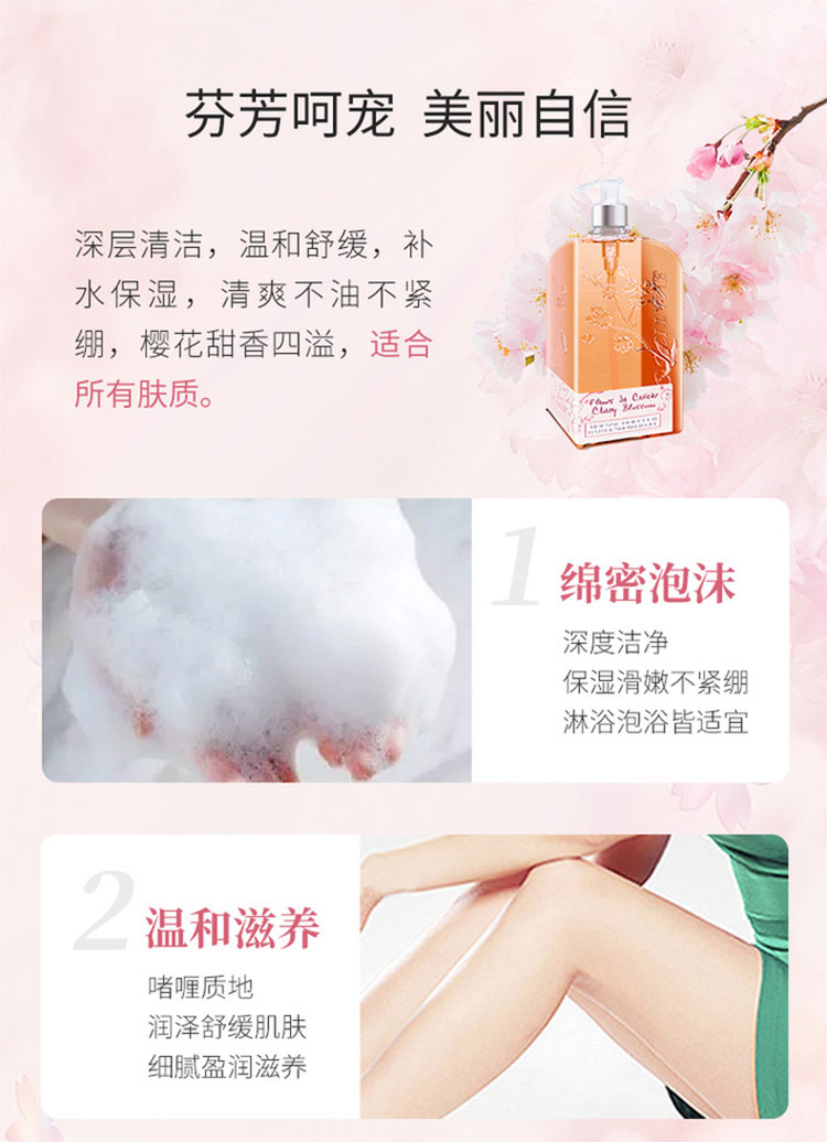 性质非常温和,散发樱花的清新细致香气;泡沫软滑浓郁,浸浴或淋浴皆宜。蕴含来自普罗旺斯吕贝宏的樱桃精萃,能柔软滋润肌肤,融合樱花清新细致的芳香,为洁净后的肌肤带来柔软与愉悦。