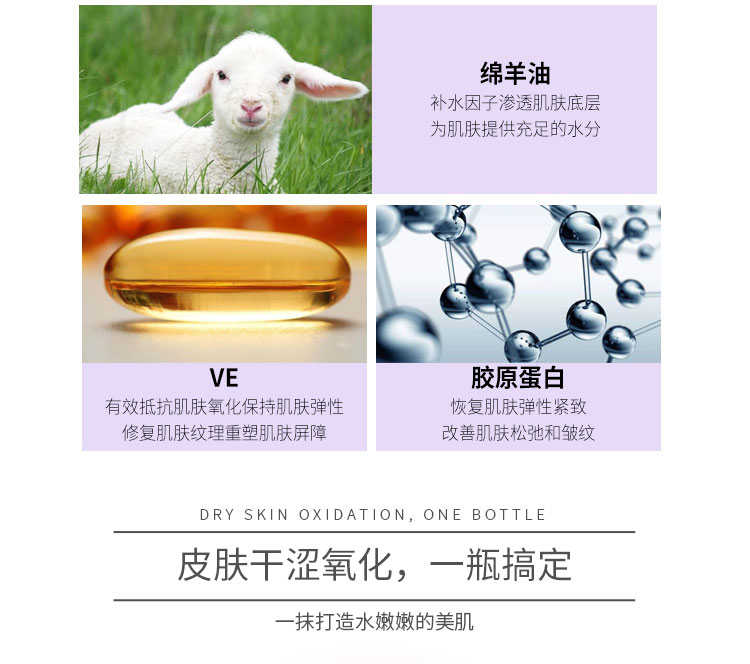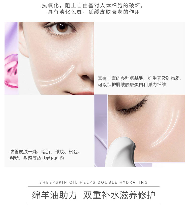 澳洲黄金葡萄籽精华,是天然的植 物抑制氧化剂,能有效丰盈表皮层, 淡化细纹丰富玫瑰精油,定制水感保湿方案,满足肌肤“渴”求,细致嬾白,将玫瑰出水精华送达肌肤底层,由内而外改善暗黄,强力锁水,采用独特的小分子水,结合先进的包覆技术,强力锁住水分。