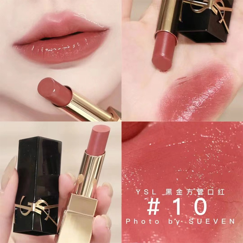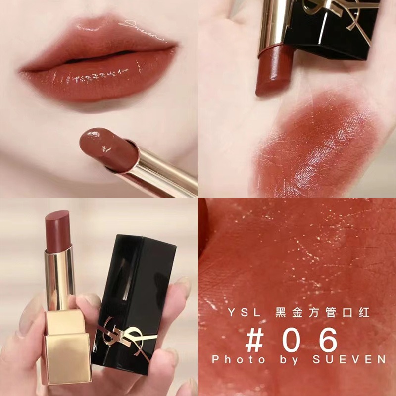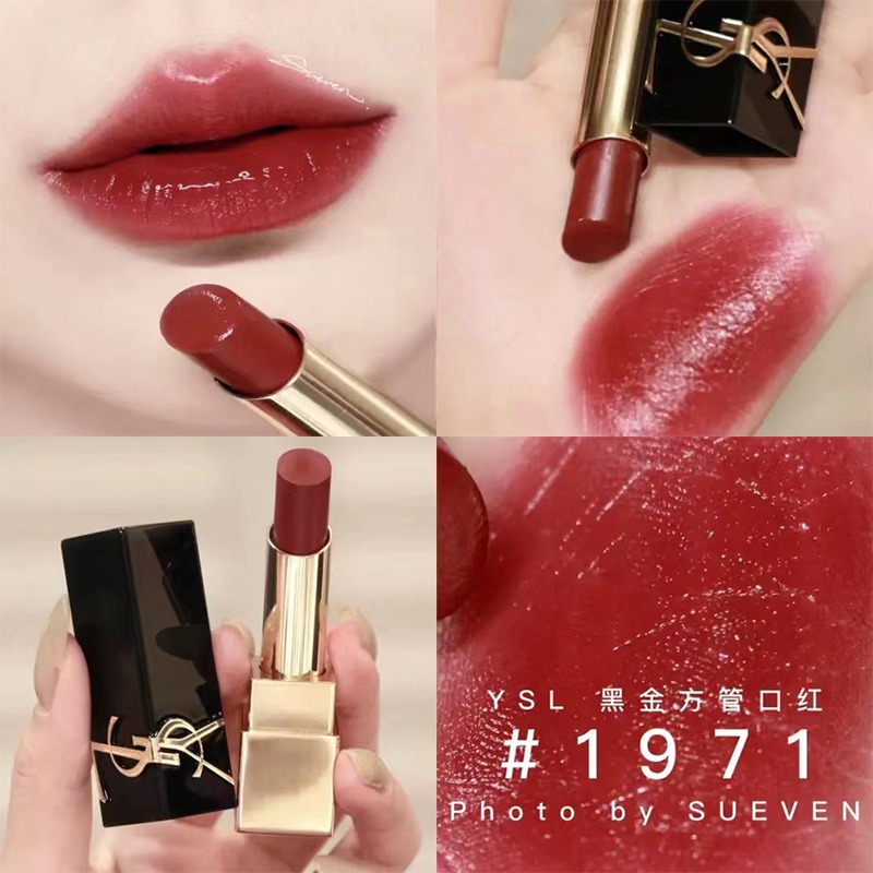 YSL1971流言枣泥色带点玫瑰感的性感红唇!薄涂也很日常全新釉光质地浓郁丝滑~上唇滋润但不粘嘴,将立体YSL logo刻在经典的黑金搭配管身上一整个高级奢华又很复古的感觉!!