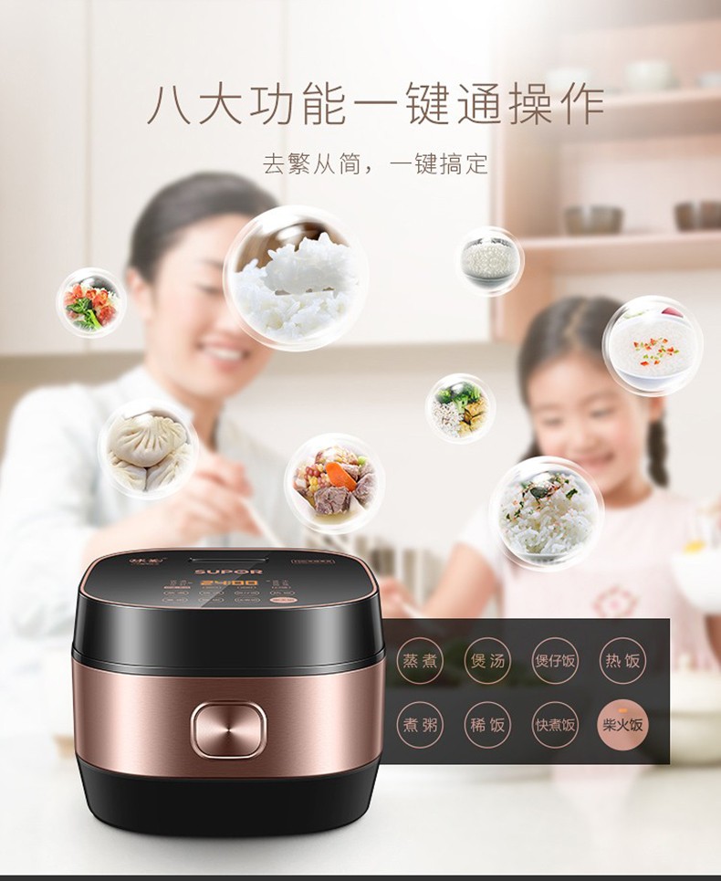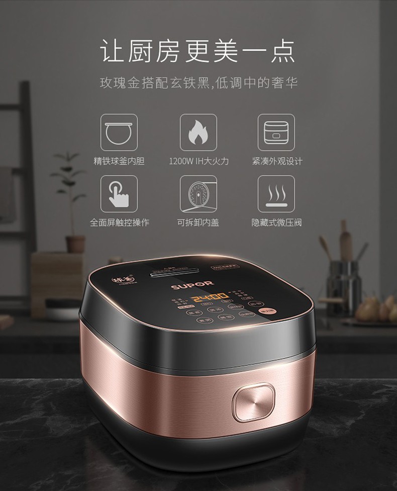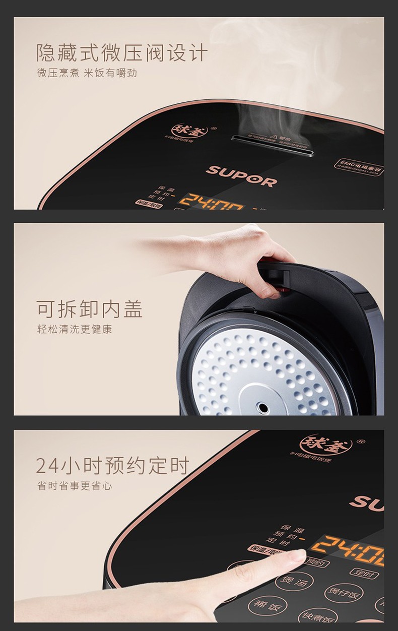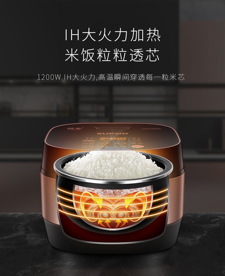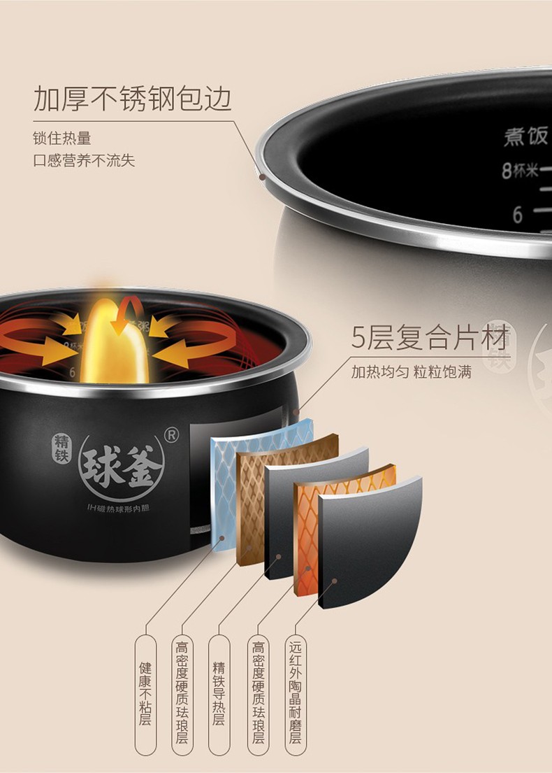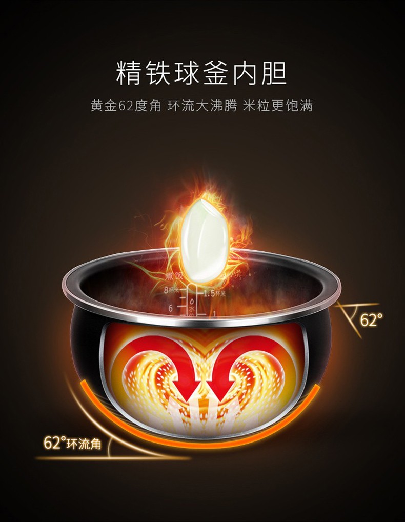 "创新球形厚釜技术,环流沸腾,粒粒饱满; IH磁热高效大火力,立体均匀受热,米饭更透芯, 功能按键一键通,操作方便更好用,精控火候系统, 控温更精准,米饭更好吃, 微压烹饪技术, 米饭有嚼劲, 可拆卸内盖,轻松清洗,24小时预约,省事省心 "