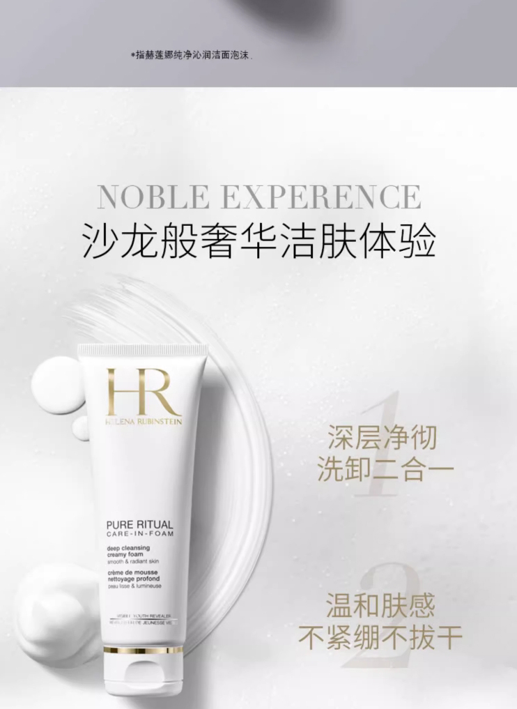 赫莲娜沁润泡沫洗面奶125mI千皮必买的保湿洁面,这款出自于HR日本研究所,灵感来自日本前沿卸妆技艺。 为氨基酸+皂基类型洁面,能够深入清洁毛孔污垢而又不会使肌肤变得紧绷,淡妆也能轻松卸除~ 通过PURE RITUAL技术,将酵母提取物与大米的两种活性成分组合,能够强效对抗自由肌,并且含有米钦成分,洁面后使肌肤焕发青春光彩~~