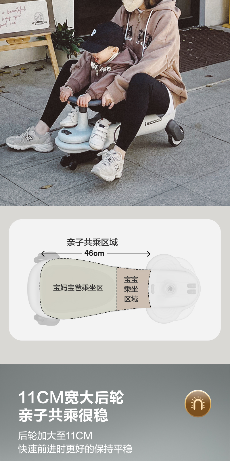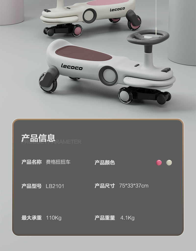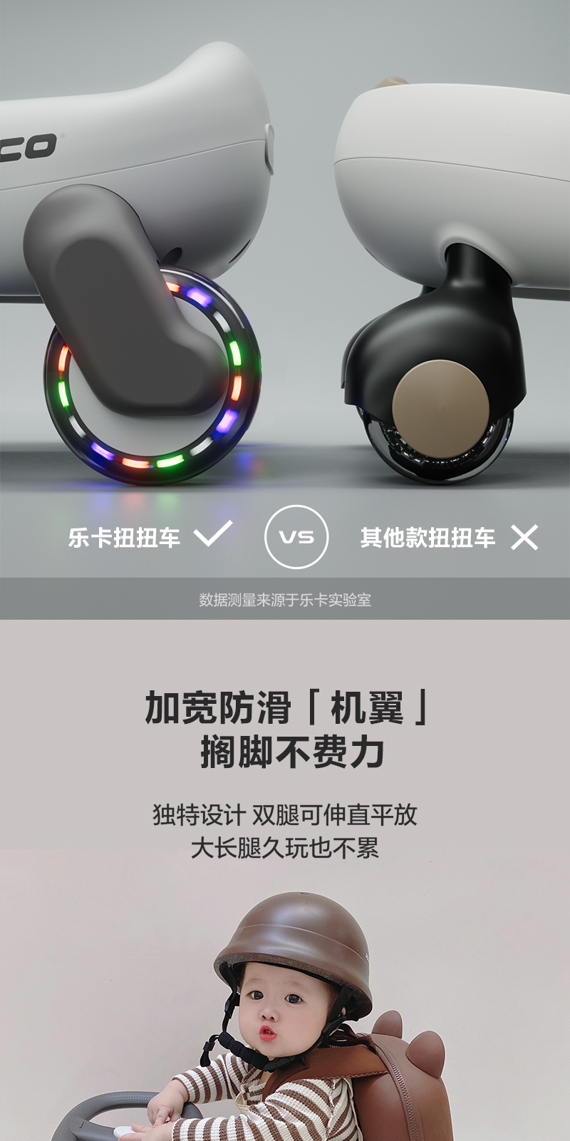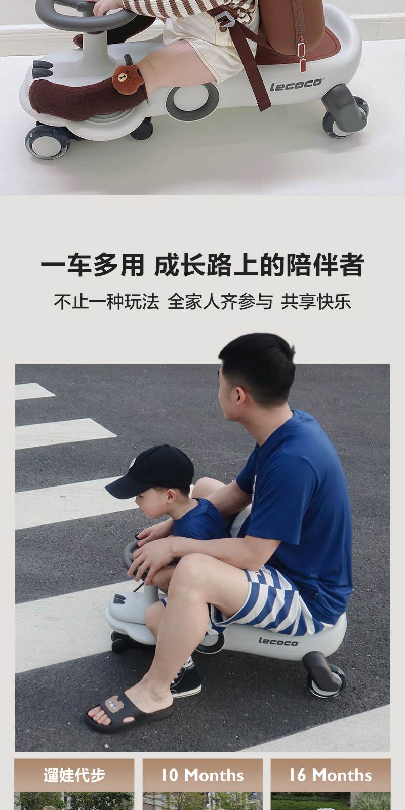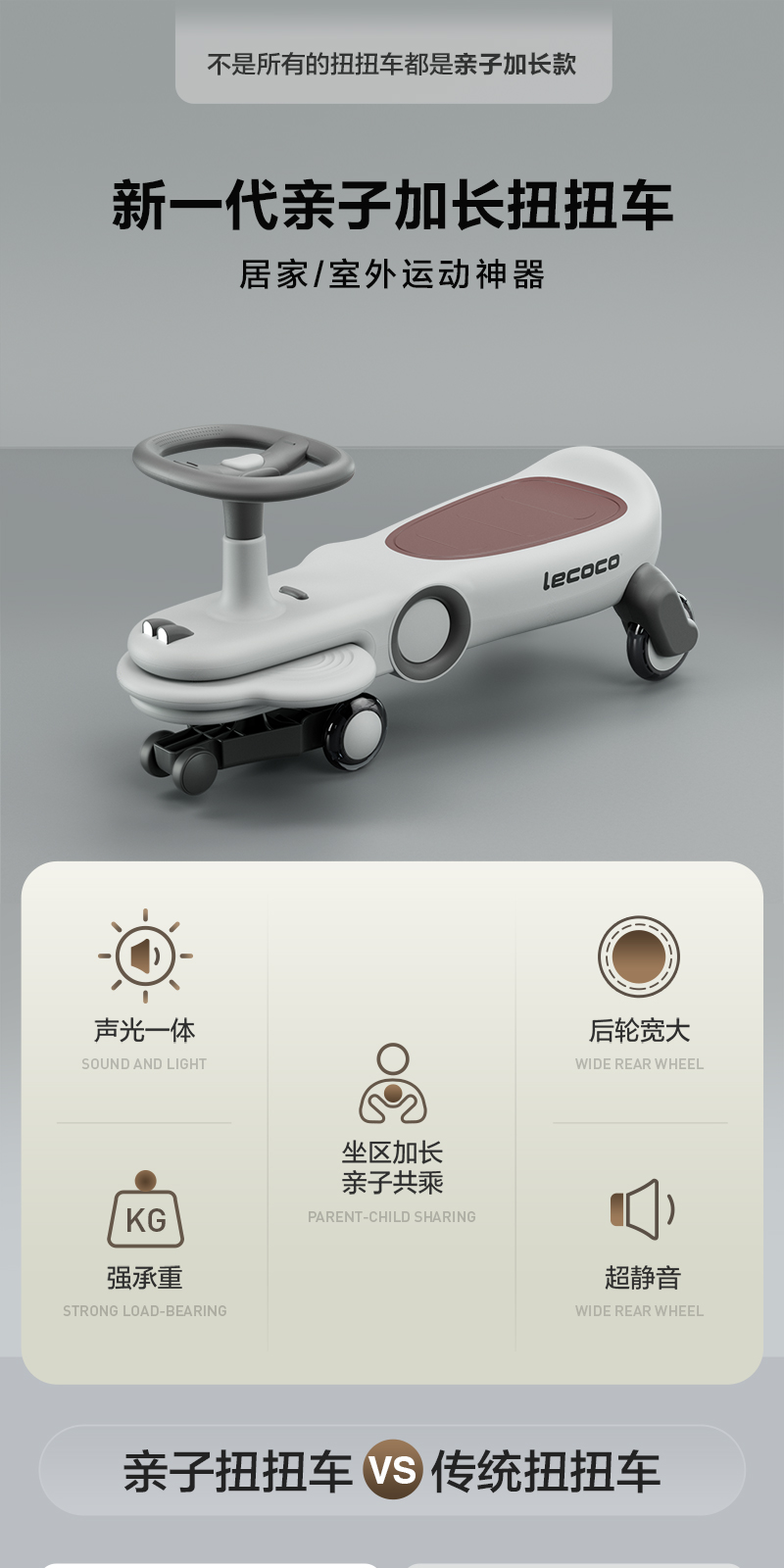 乐卡亲子加长扭扭车 关键卖点:1、承重强(110kg) 2、多种玩法:6月+亲子共乘、宝宝自驾、牵引绳拉着可代步遛娃)3、可坐区域大(方向盘下空间能利用),亲子舒适共乘 4、后轮宽大,稳固防侧翻 5、轮子静音不伤地板 6、趣味增加:小喇叭、车灯、音乐 7、操作灵活顺滑