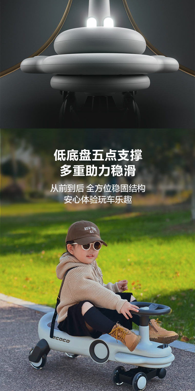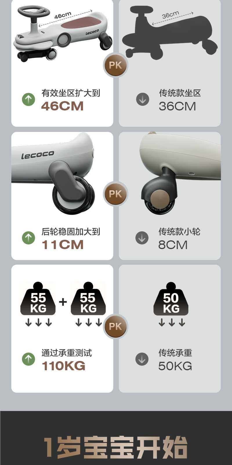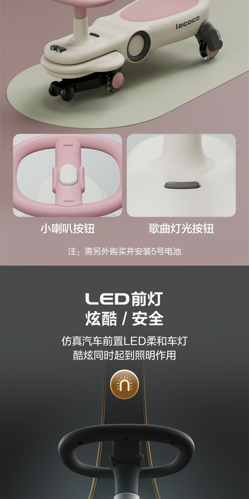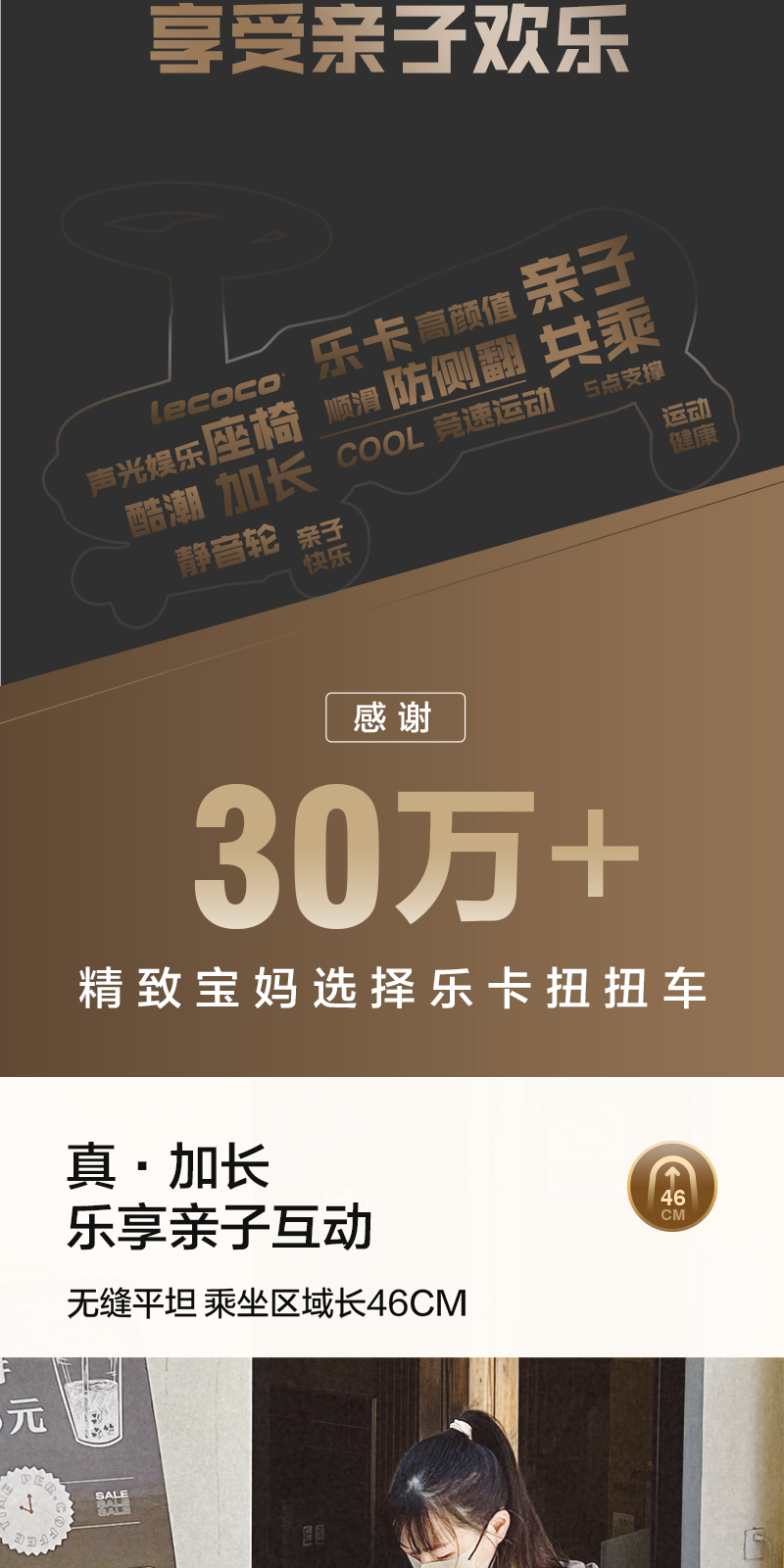 乐卡亲子加长扭扭车 关键卖点:1、承重强(110kg) 2、多种玩法:6月+亲子共乘、宝宝自驾、牵引绳拉着可代步遛娃)3、可坐区域大(方向盘下空间能利用),亲子舒适共乘 4、后轮宽大,稳固防侧翻 5、轮子静音不伤地板 6、趣味增加:小喇叭、车灯、音乐 7、操作灵活顺滑