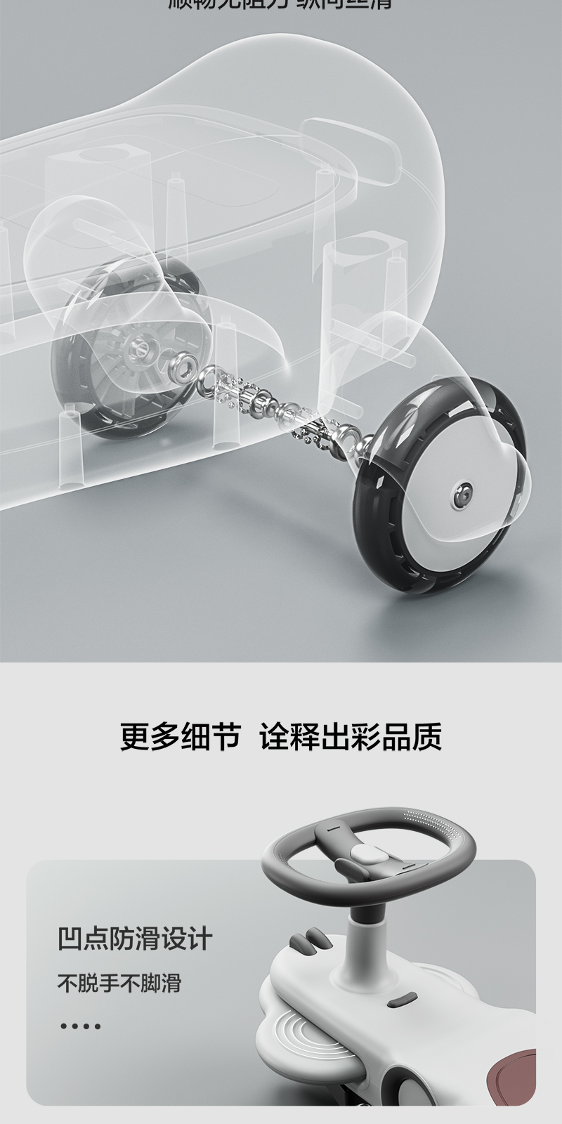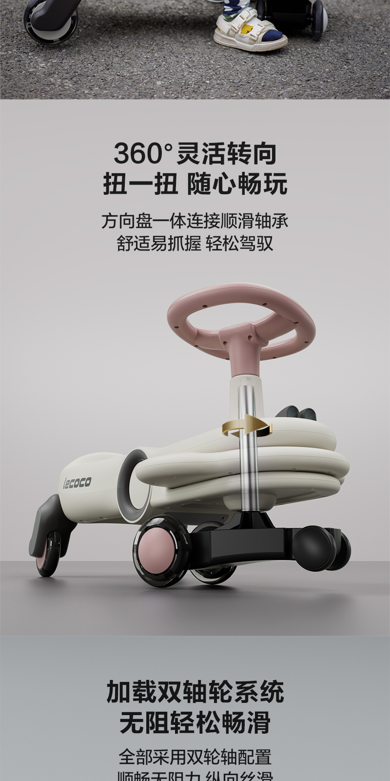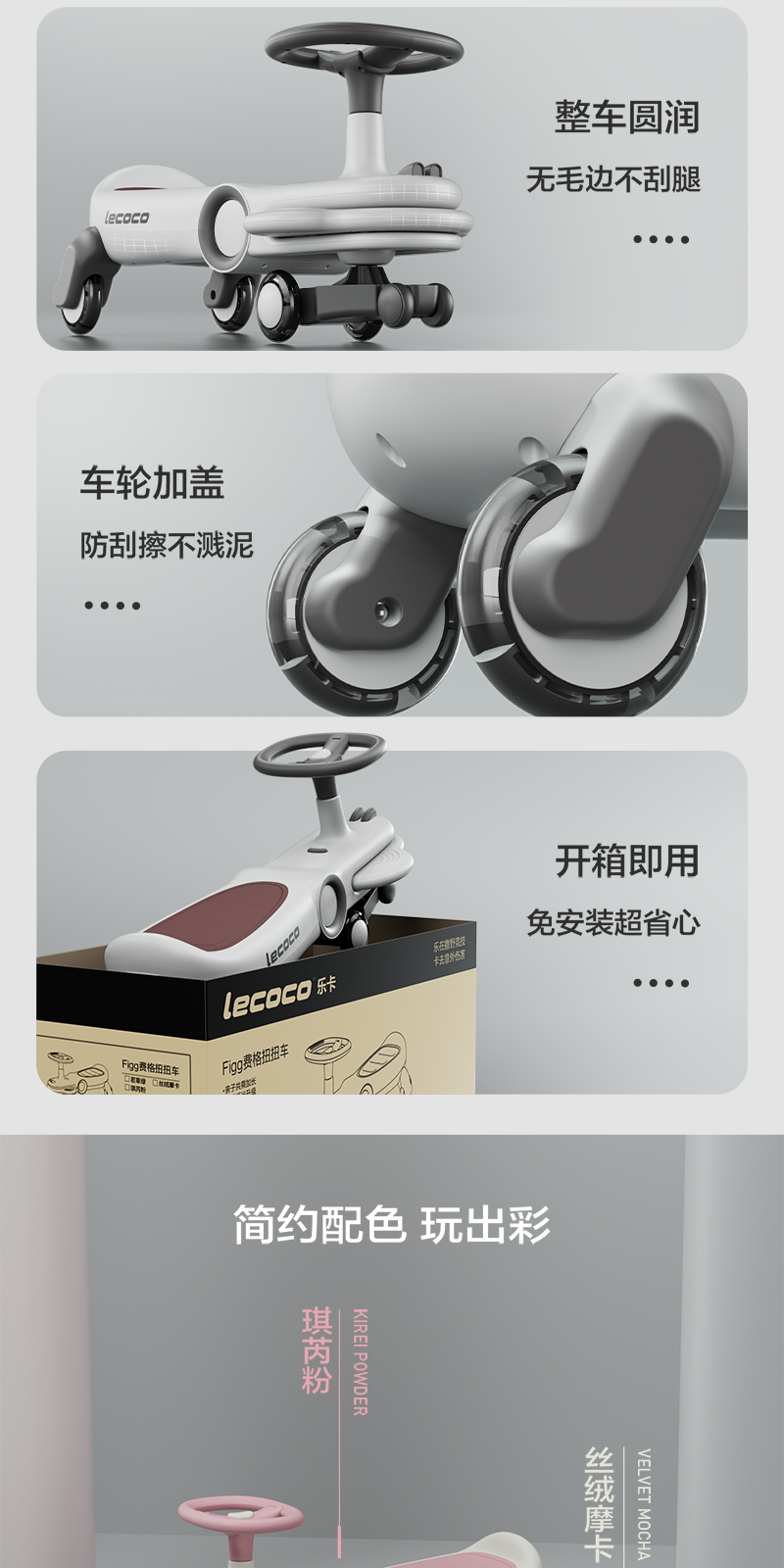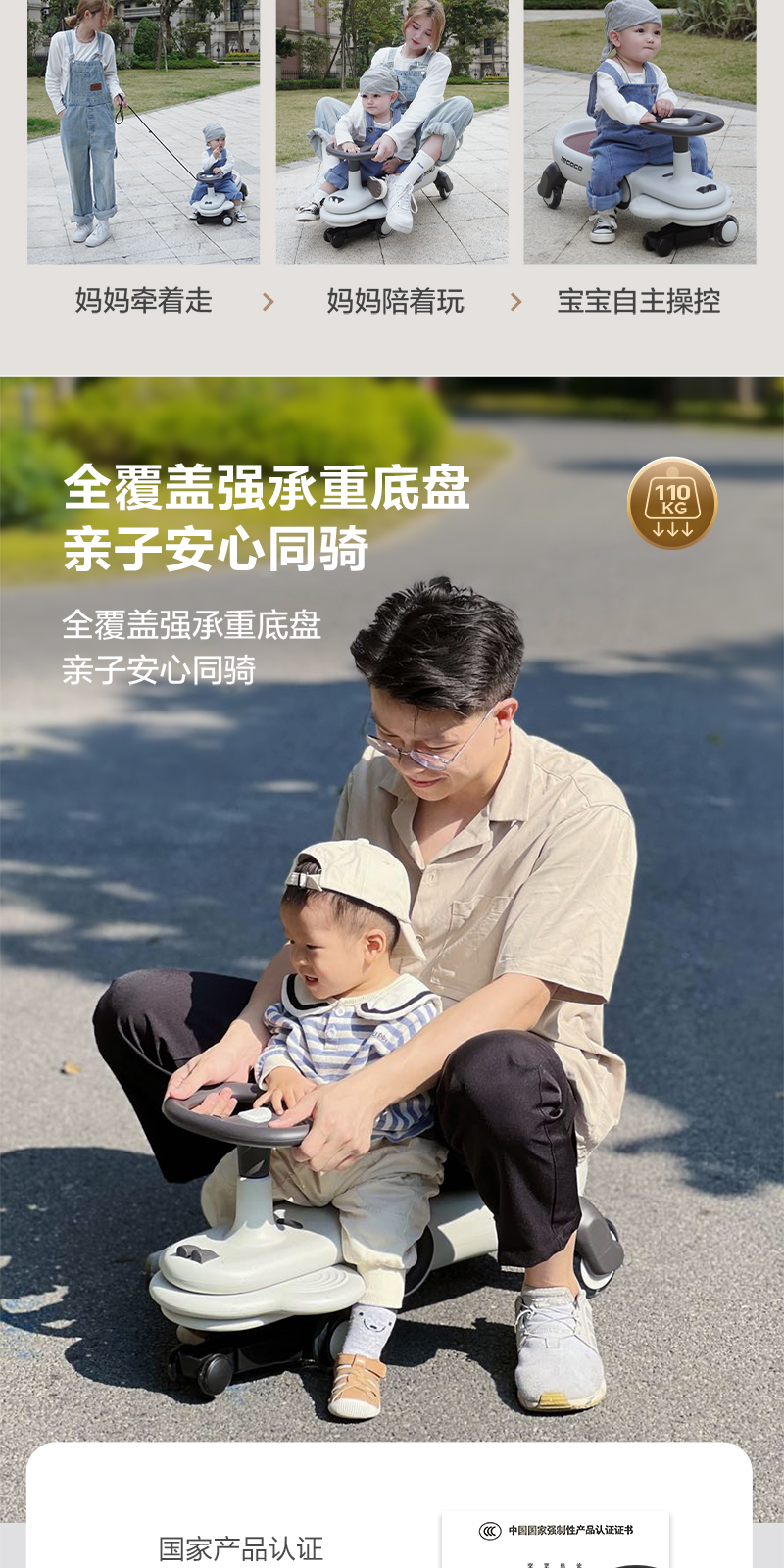 乐卡亲子加长扭扭车 关键卖点:1、承重强(110kg) 2、多种玩法:6月+亲子共乘、宝宝自驾、牵引绳拉着可代步遛娃)3、可坐区域大(方向盘下空间能利用),亲子舒适共乘 4、后轮宽大,稳固防侧翻 5、轮子静音不伤地板 6、趣味增加:小喇叭、车灯、音乐 7、操作灵活顺滑