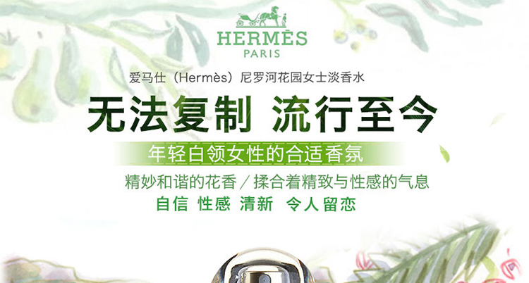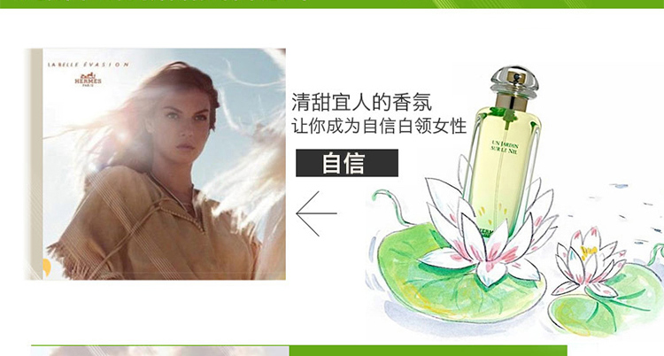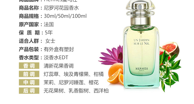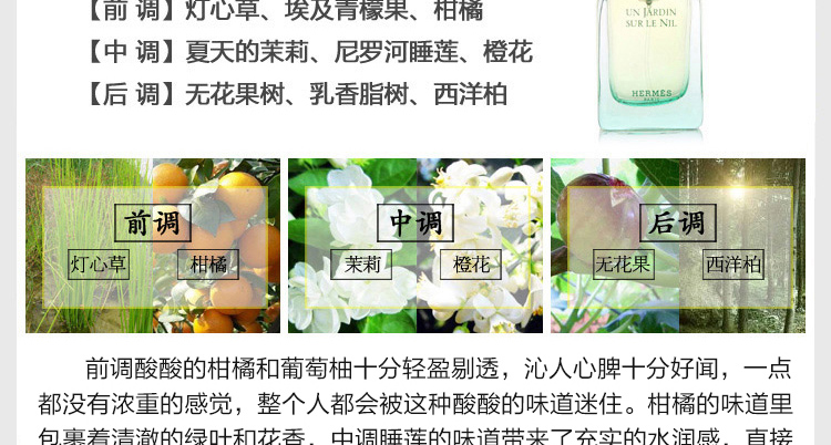 爱马仕尼罗河香水,融合了果香、青草香和木香,有一种混合嫩芽和果肉的新鲜,暗藏着胡萝卜的清脆和西红柿茎的青涩,同时,具有果香的青芒果滋味,再加入冲鼻有带点苦涩的葡萄柚的芬芳,也随之飘了出来,香氛中还溢出橙心草清新的果香,春意十足。融合了果香、青草香和木香。调香师Jean-Claude Ellena这次以淡雅的莲花,试图创作一个想像的花园。在意念上,这支香水表达的是串联过去、现在与未来的永恒时间观。是一支男女都适用的香水。