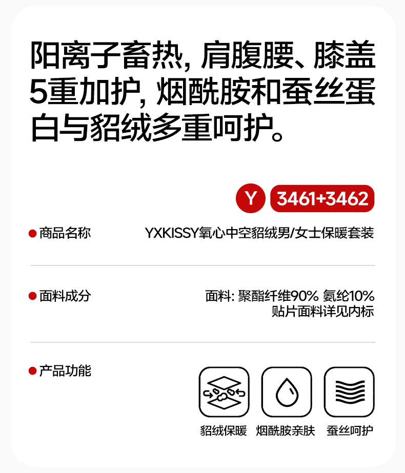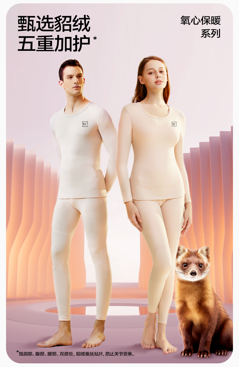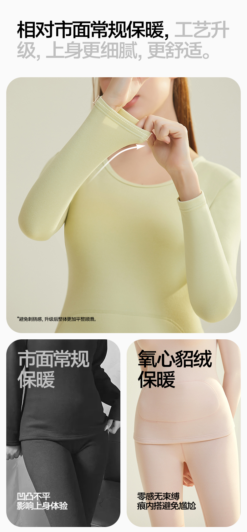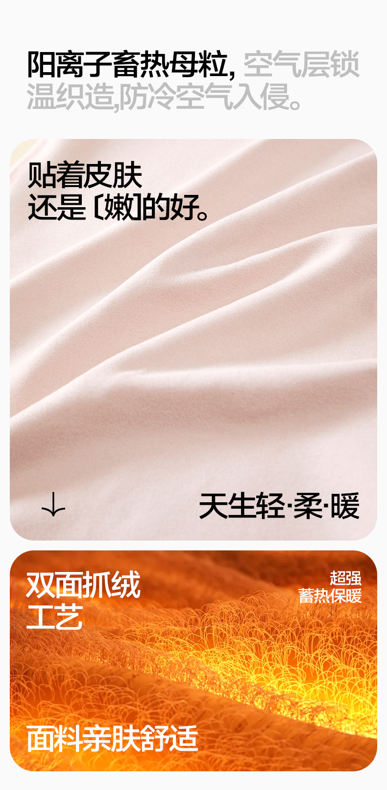 面料纱线采用阳离子畜热母粒,空气层锁温织造,双面抓绒工艺,面料亲肤舒适,弹力适中,拒绝静电,极致抗起球,超强蓄热保暖,特别添加“烟酰胺”和“蚕丝蛋白”,在寒冷干燥的冬天里,兼顾保暖与呵护,最大限度防止皮肤干燥发痒,亲肤养肤润肤,版型根据人体工学原理,立体剪裁,采用四针六线无骨缝合,伸展自如,0感无束缚,无痕内搭避免尴尬。肩部、腹部、腰部、膝盖5重加护,加护面料特添加发热纤维晴纶、极致御寒貂绒,润肤养肤蚕丝,多重呵护,保暖强效升级,温暖加倍,拒绝臃肿,一套过冬!