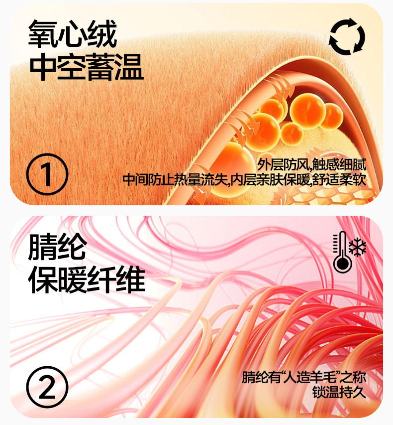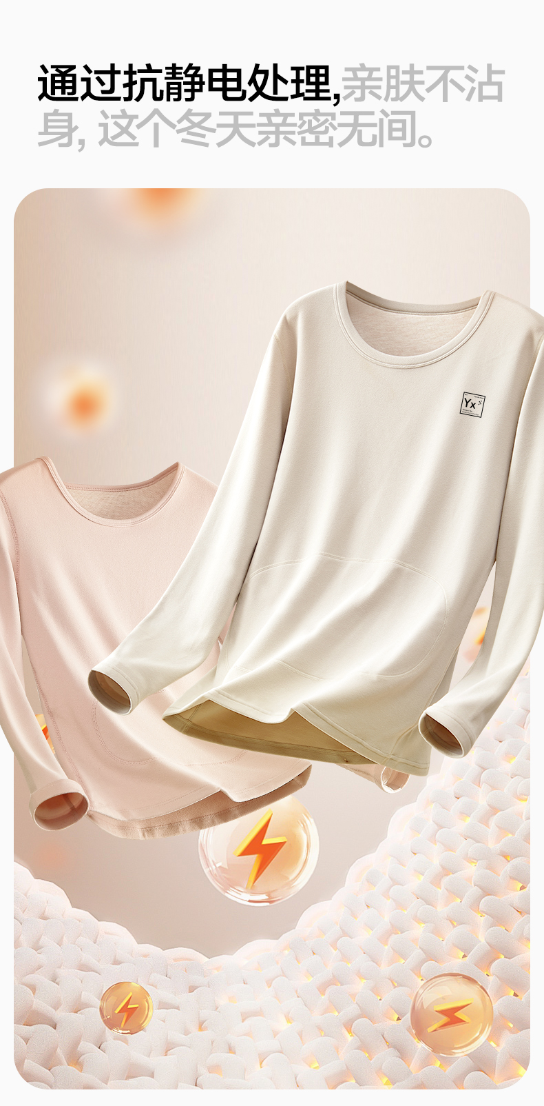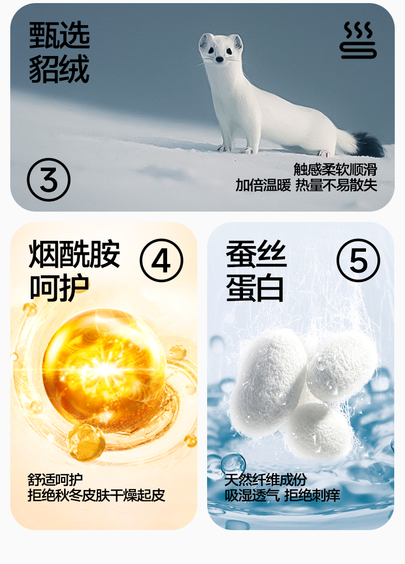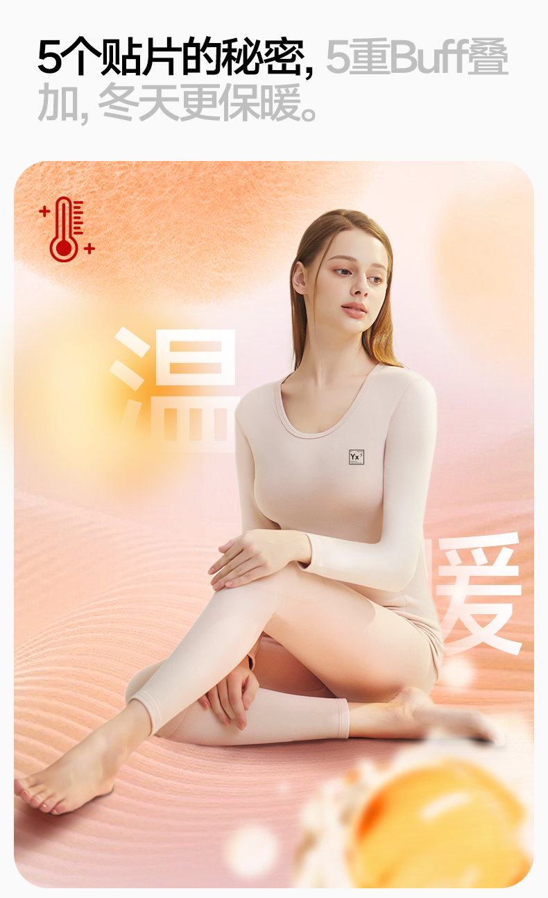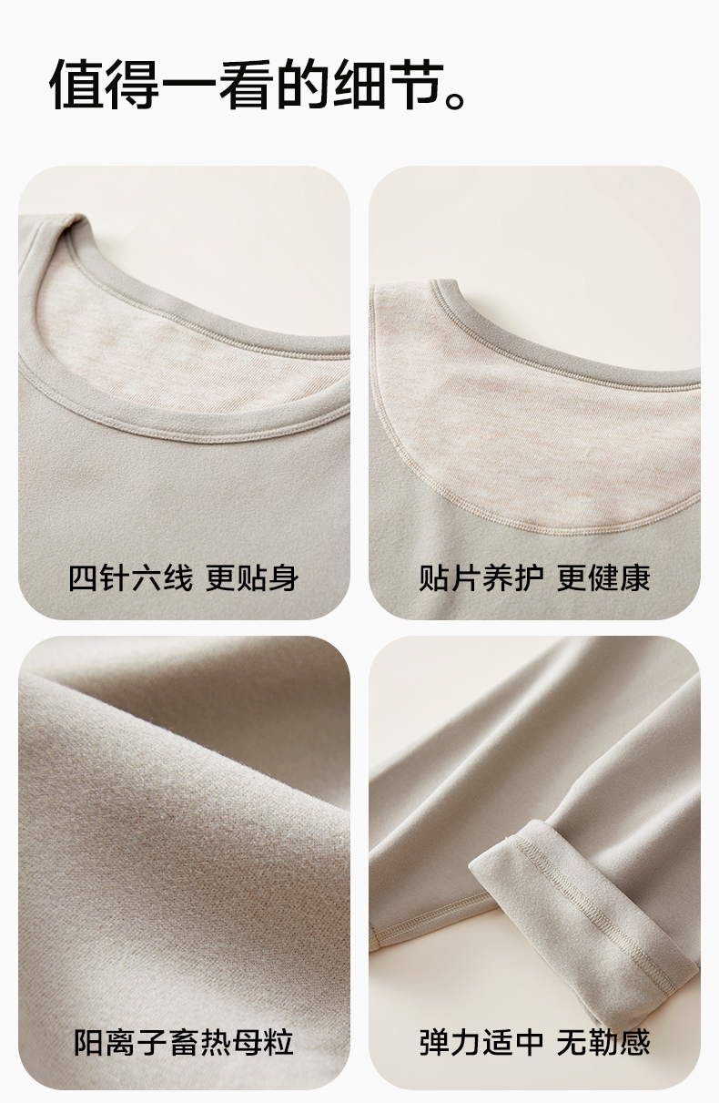 面料纱线采用阳离子畜热母粒,空气层锁温织造,双面抓绒工艺,面料亲肤舒适,弹力适中,拒绝静电,极致抗起球,超强蓄热保暖,特别添加“烟酰胺”和“蚕丝蛋白”,在寒冷干燥的冬天里,兼顾保暖与呵护,最大限度防止皮肤干燥发痒,亲肤养肤润肤,版型根据人体工学原理,立体剪裁,采用四针六线无骨缝合,伸展自如,0感无束缚,无痕内搭避免尴尬。肩部、腹部、腰部、膝盖5重加护,加护面料特添加发热纤维晴纶、极致御寒貂绒,润肤养肤蚕丝,多重呵护,保暖强效升级,温暖加倍,拒绝臃肿,一套过冬!