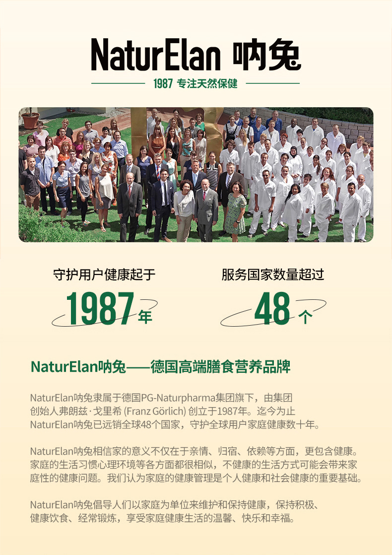 NaturElan,是德国高端营养品创领品牌,隶属德国PG-Naturpharma GmbH,由创始人弗朗兹·戈里希 (Franz Görlich)创立于1987年,迄今为止NaturElan已远销全球多个国家。在德语中,Natur是自然,Elan是力量。作为德国膳食补充剂领域创领品牌之一,NaturElan呐免致力于守护家庭营养健康,始终以严谨专业的态度开发高品质膳食营养补充剂,坚持使用天然原料,践行严格质量标准准则——Made in Germany。