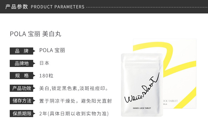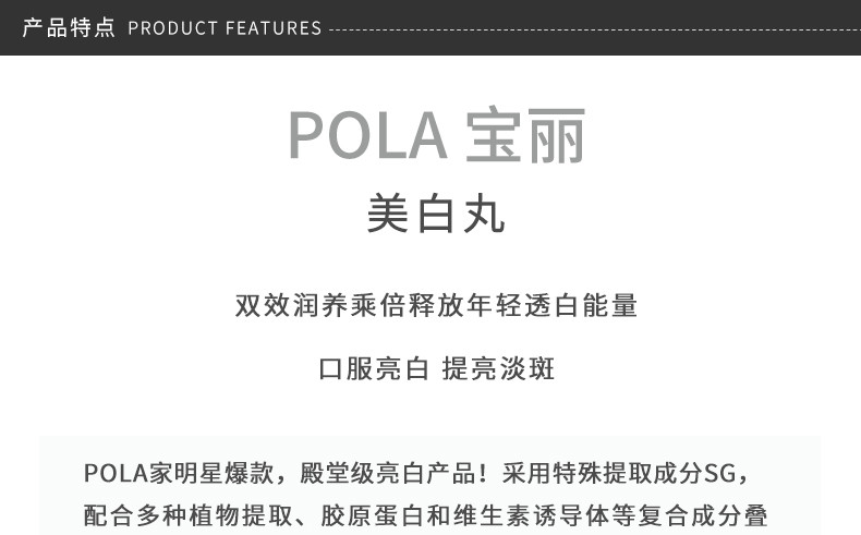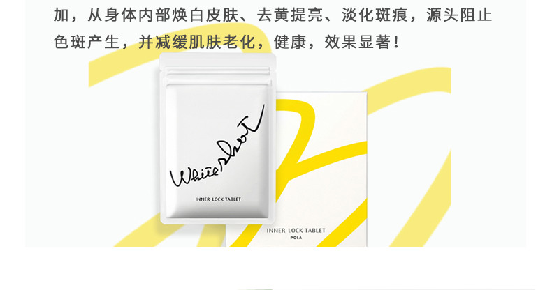 这款美白淡斑丸主要含有松树皮抽出成分SG、蜜桔皮抽出成分、黑胡椒抽出成分、胶原蛋白等复合成分,含有抑制黑色素的L-半胱氨酸,通过体内代谢排除过脂化黑细胞中的黑色素,从而达到美白效果。可以改善肤色暗沉、色斑等症状。