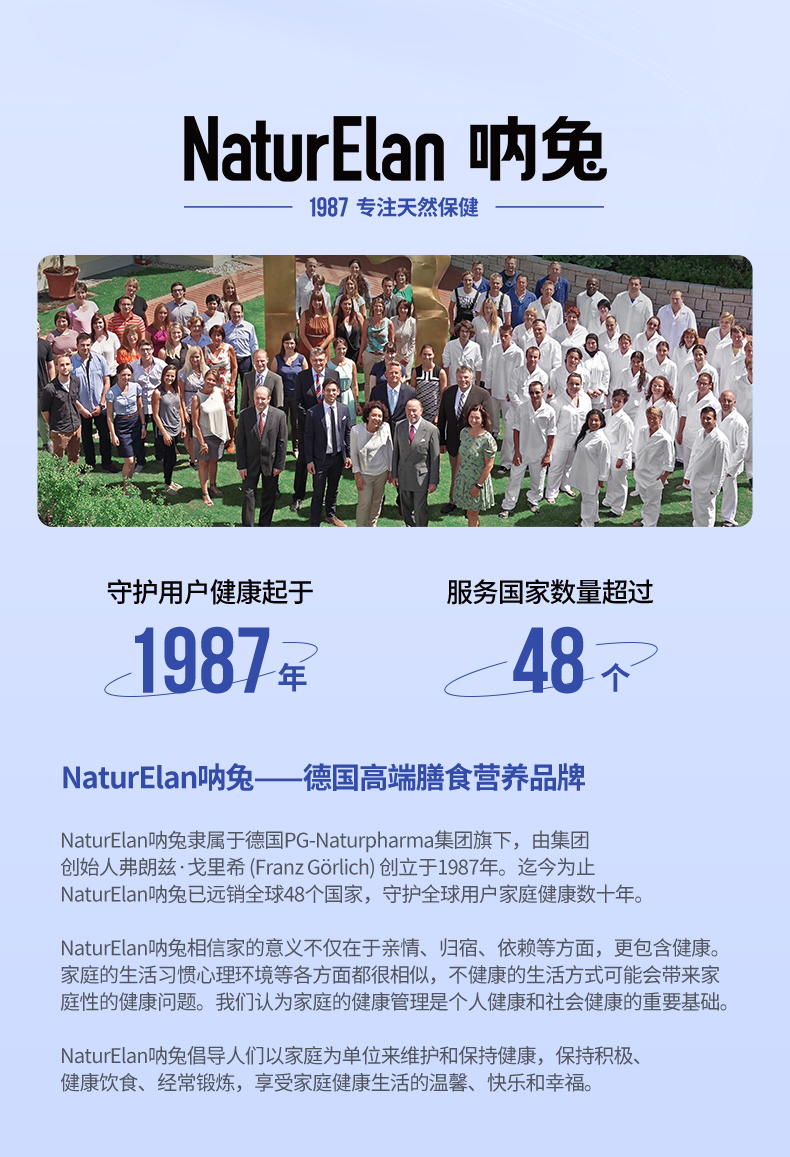 NaturElan,是德国高端营养品创领品牌,隶属德国PG-Naturpharma GmbH,由创始人弗朗兹·戈里希 (Franz Görlich)创立于1987年,迄今为止NaturElan已远销全球多个国家。在德语中,Natur是自然,Elan是力量。作为德国膳食补充剂领域创领品牌之一,NaturElan呐免致力于守护家庭营养健康,始终以严谨专业的态度开发高品质膳食营养补充剂,坚持使用天然原料,践行严格质量标准准则——Made in Germany。