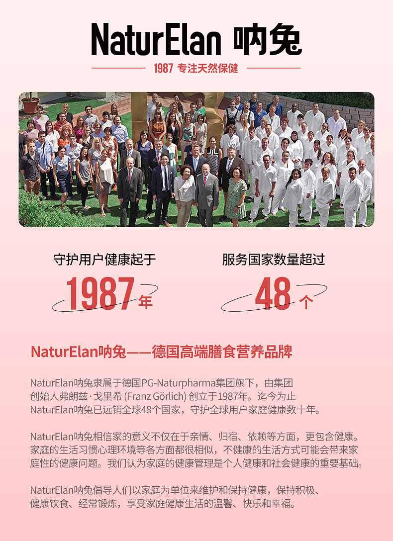 NaturElan,是德国高端营养品创领品牌,隶属德国PG-Naturpharma GmbH,由创始人弗朗兹·戈里希 (Franz Görlich)创立于1987年,迄今为止NaturElan已远销全球多个国家。在德语中,Natur是自然,Elan是力量。作为德国膳食补充剂领域创领品牌之一,NaturElan呐免致力于守护家庭营养健康,始终以严谨专业的态度开发高品质膳食营养补充剂,坚持使用天然原料,践行严格质量标准准则——Made in Germany。