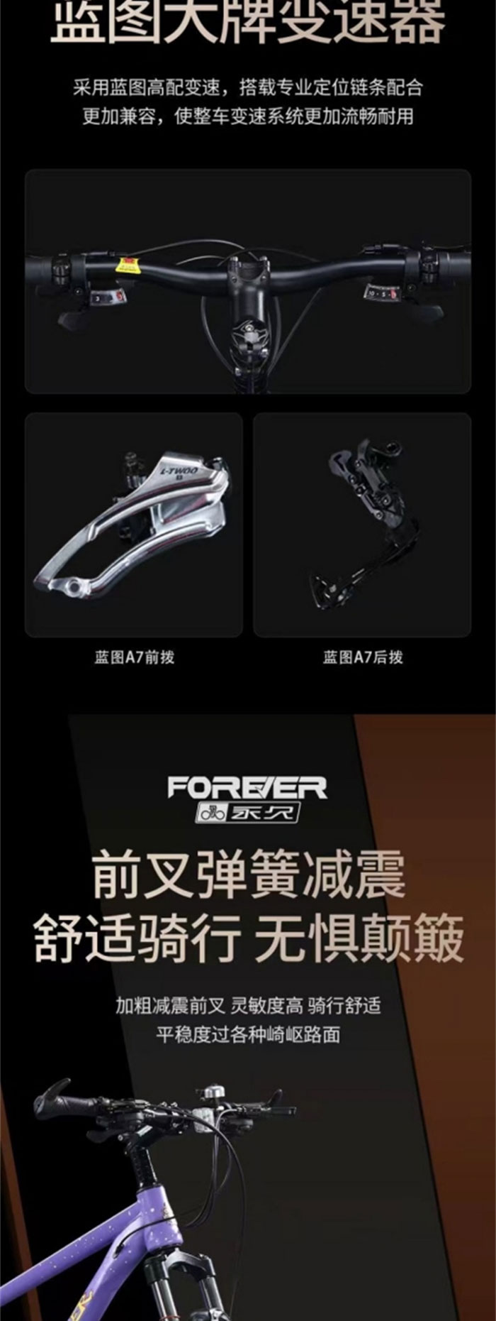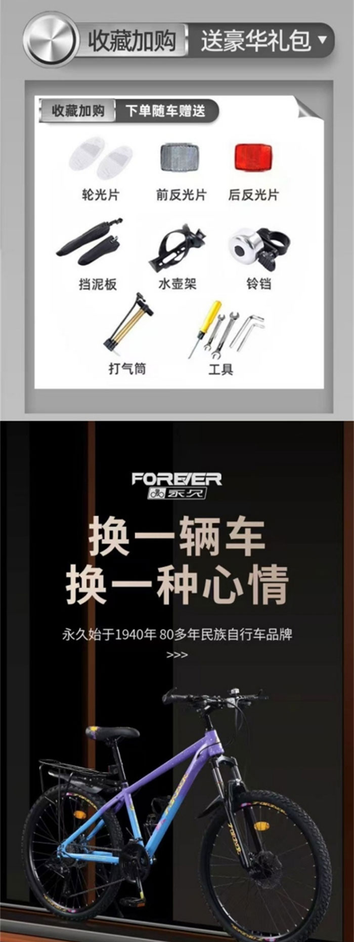 下单即送豪华大礼包,永久自行车80多年专业品质80多年把控细节,轻量化车身,双肩减震,灵敏碟刹,高承重车圈,精准变速,舒适座椅。加宽大轮胎,平稳抓地强,多档数别可选,轻松快乐骑行,速别提升,性能升级,前后双碟刹,停车稳稳滴,不变形高承重铝合金辐条轮毂,变速顺滑灵敏蓝图大牌变速器,前叉弹簧减震舒适骑行无惧颠簸,180度限位头管骑行更易平衡安全,10片旋飞式塔轮,变速顺滑,骑行省力,舒适加厚座椅,减少压迫感,乘坐舒适,24寸适合身高1米45~1m75,26寸适合身高1米55~1m85,27.5寸,适合身高1米75~1m95。