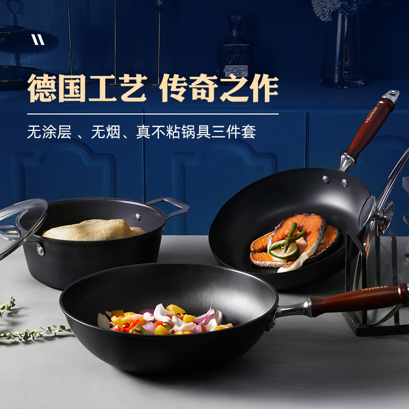 "旋压技术,锅体轻薄,轻松掂锅翻炒,纯手工打造。 榉木手柄-甄选琴弦级的榉木, 提炼精粹矿物铁,富含微量元素。 不含任何有毒物质和化学涂层。 炒汤煎三件套礼盒装,炒锅32cm,煎锅28cm,汤锅3.5L。 "